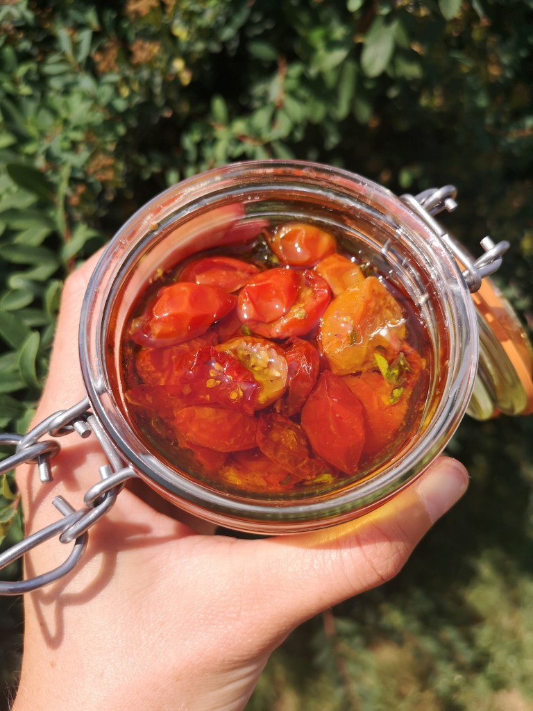Placer les tomates dans un bocal à fermeture hermétique type Le Parfait, recouvrir d’une bonne huile d’olive et fermer.