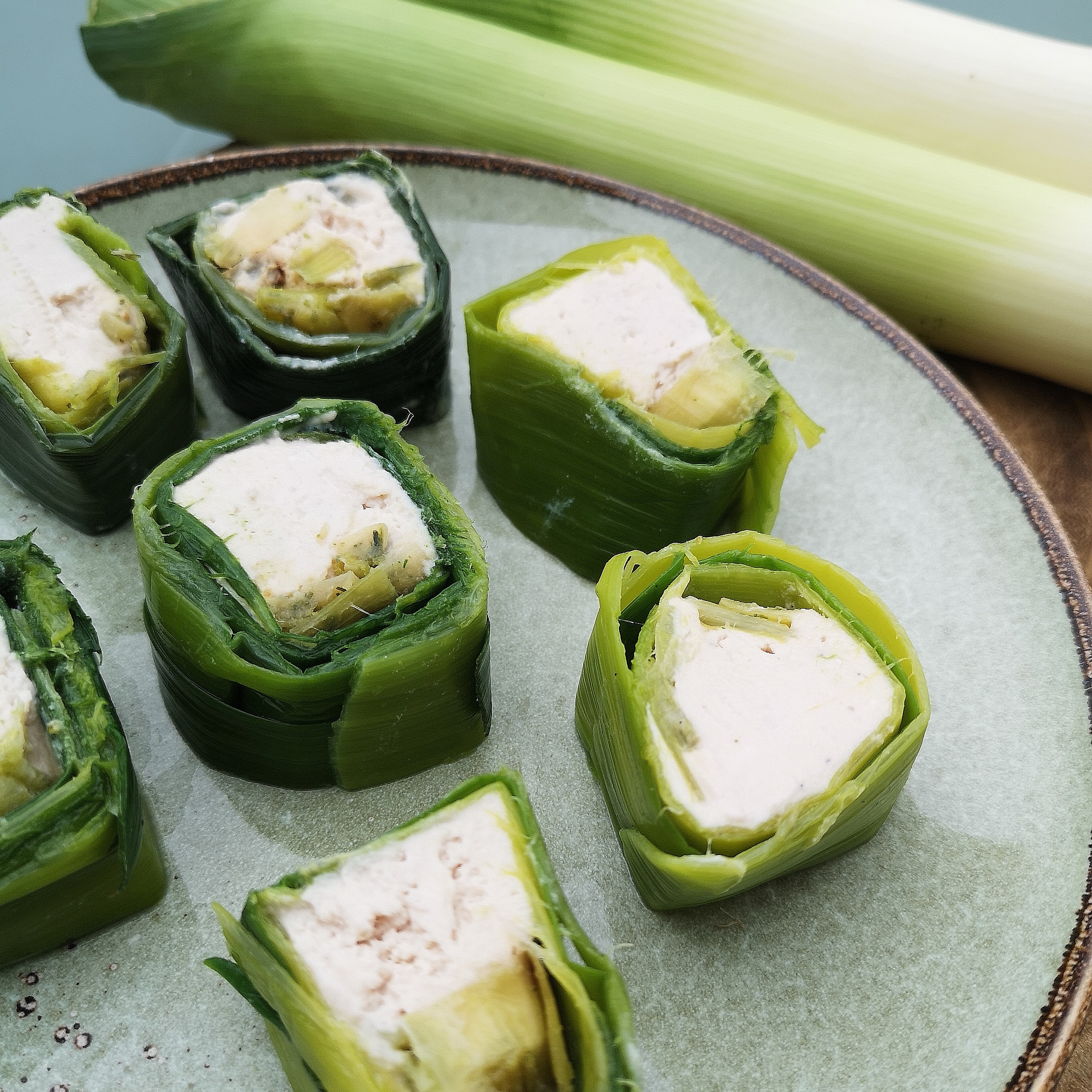 Déposer le fromage frais au thon sur le bas des lamelles de poireau et rouler comme un maki.