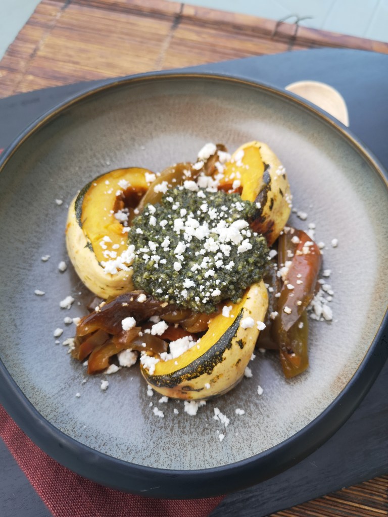 Dans une assiette creuse, disposer des lamelles de courge, de poivrons, déposer une belle noix de pesto de fanes de carottes et ajouter la feta émiettée.