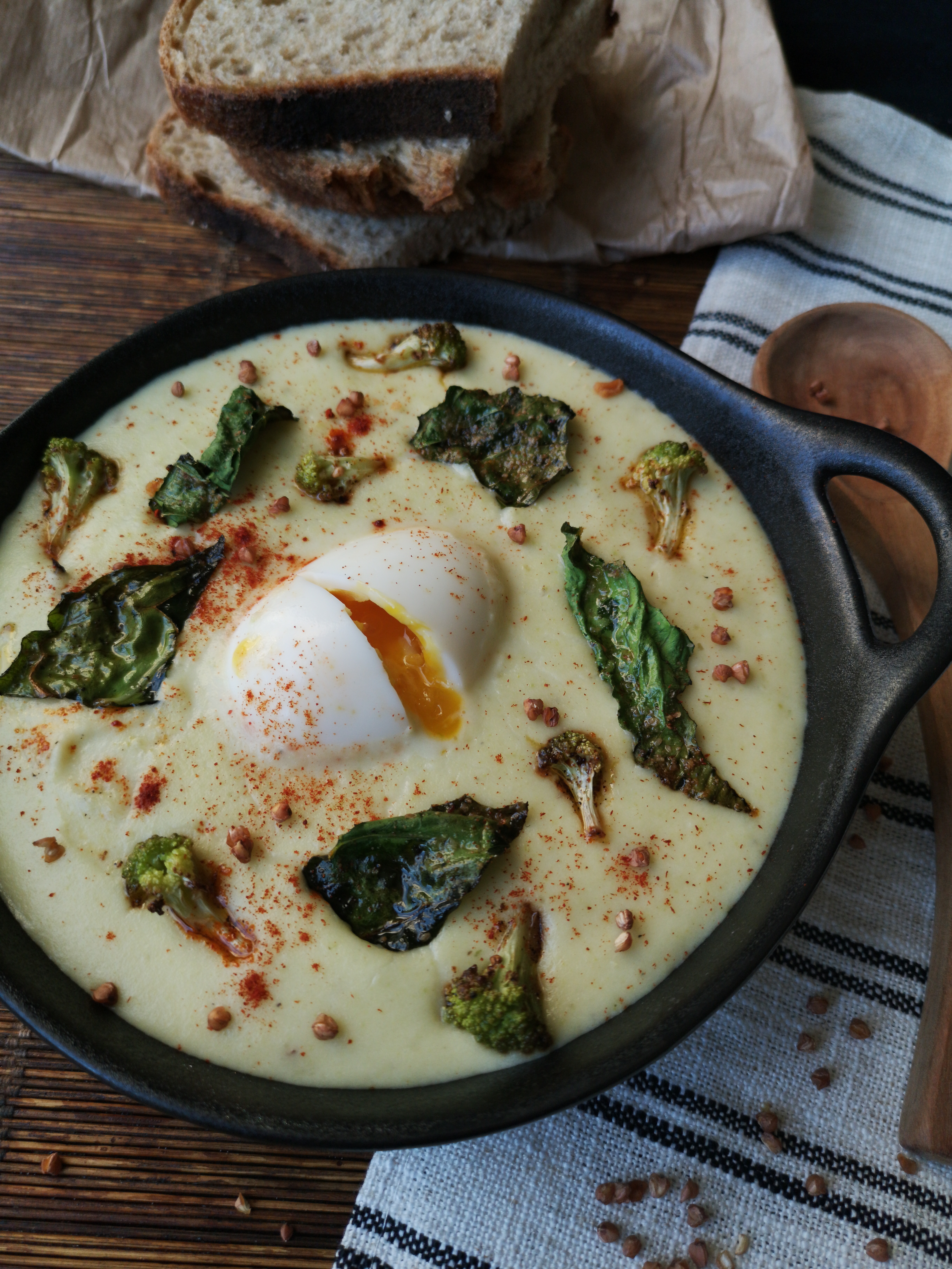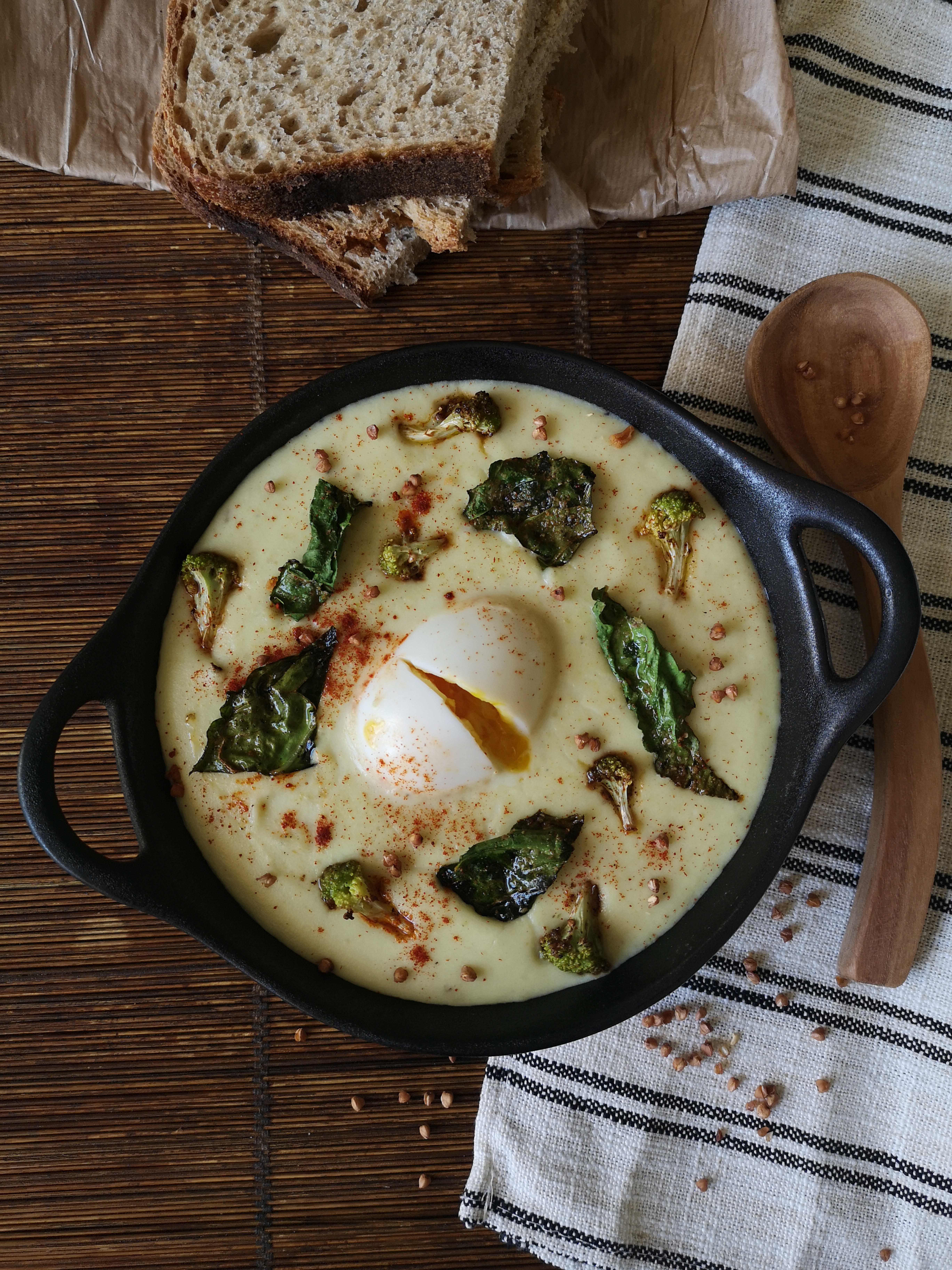 Dans une assiette creuse, déposer quelques louches de velouté. Déposer l’oeuf mollet au centre. Ajouter quelques chips de feuilles de chou-fleur, des fleurs rôties à la sauce soja, quelques graines de sobacha et saupoudrer un peu de Pimenton de la Vera.