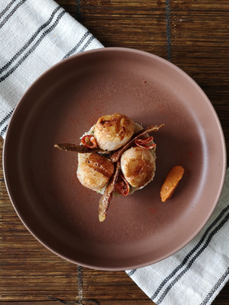 Dans une assiette, faire un rond d’écrasé de chou-fleur à l’aide d’un emporte-pièce. Déposer dessus 4 St-Jacques par assiettes. Ajouter des petites lamelles de chorizo pour le peps et quelques chips d’épluchures de pommes de terre pour le croustillant.
