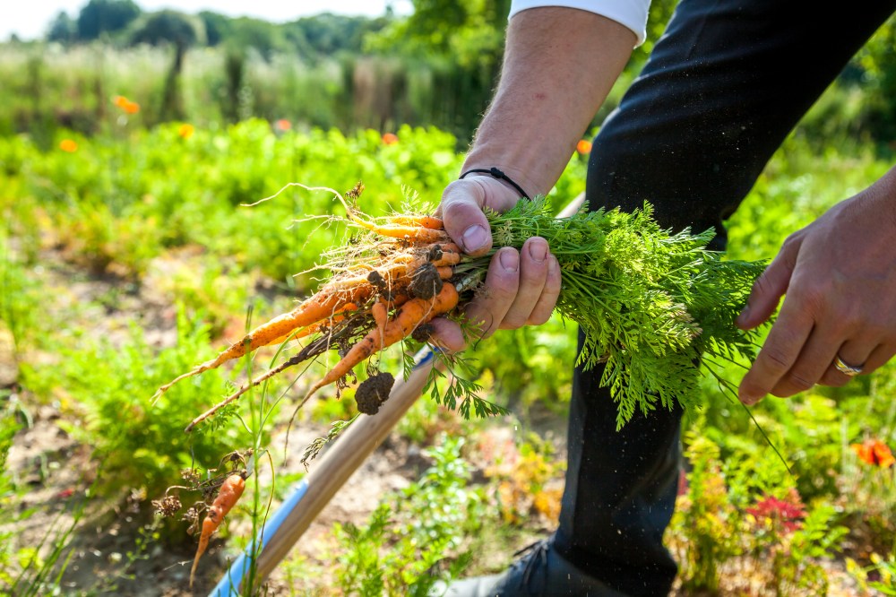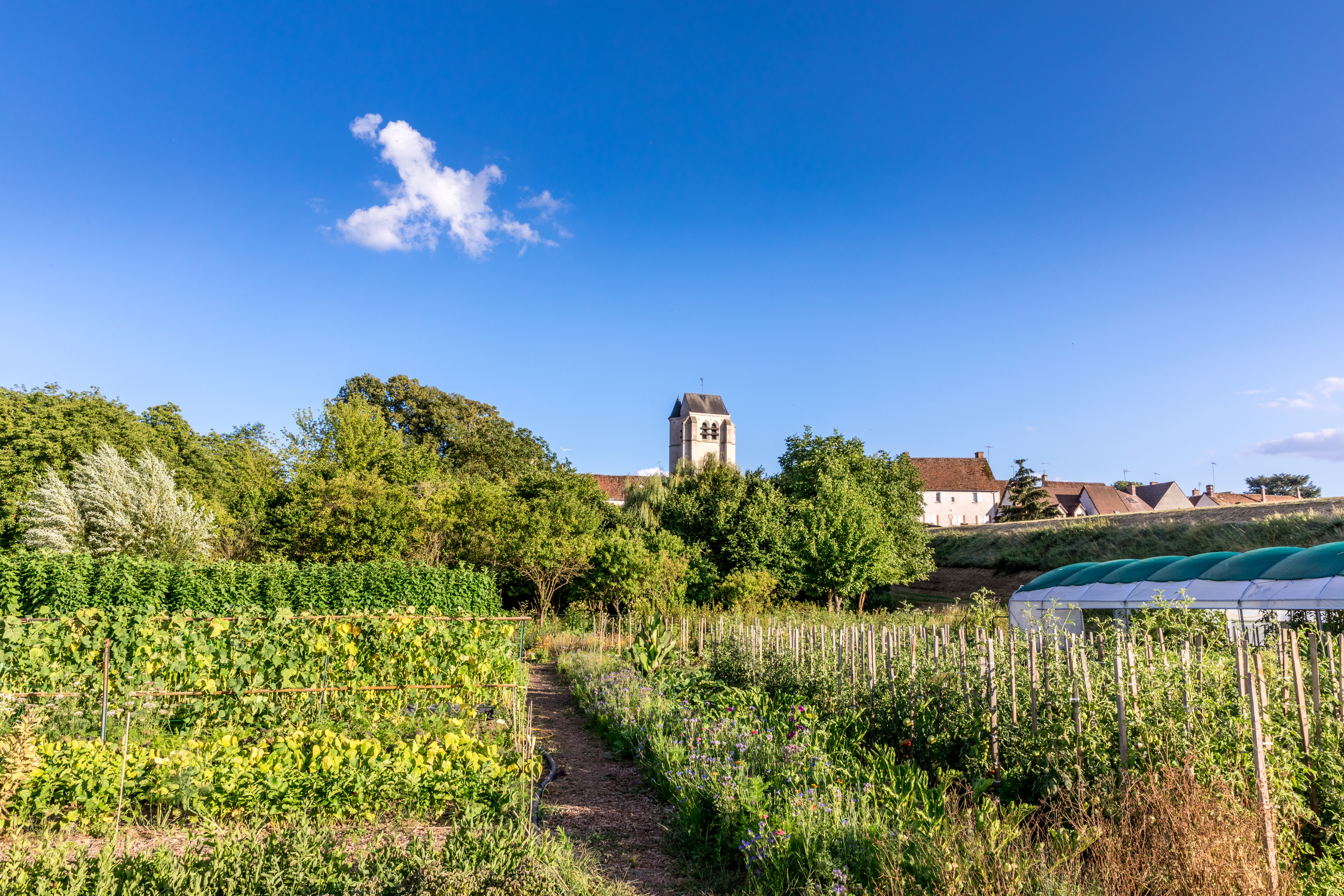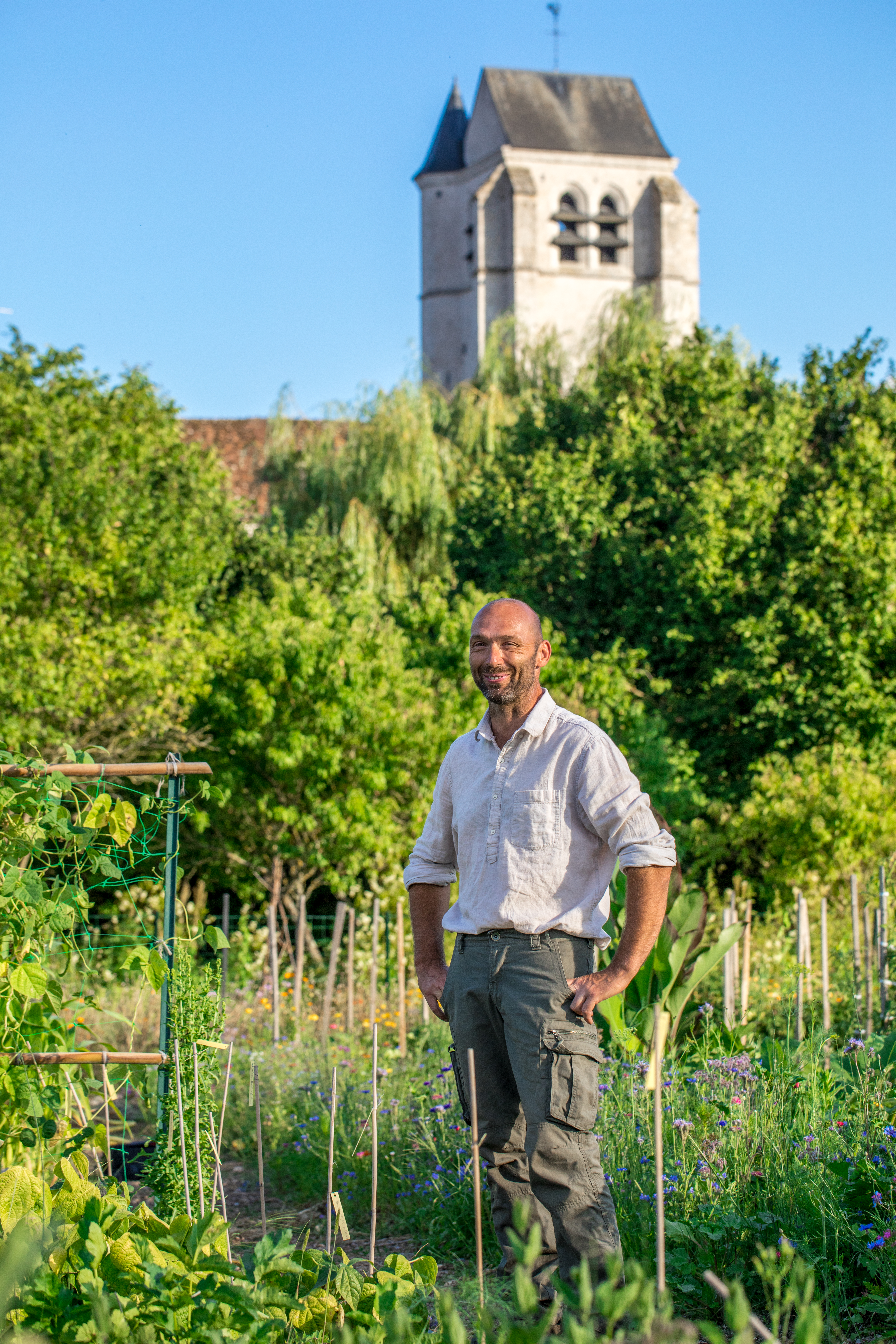 Ici son ami et collaborateur Alain Gaillard cultive fruits, légumes, herbes et fleurs comestibles en permaculture, pour fournir les cuisines du restaurant étoilé. On y trouve selon la saison des tomates, des courges, des aubergines, mais aussi des plantes étonnantes comme l’armoise cola ou la santoline.