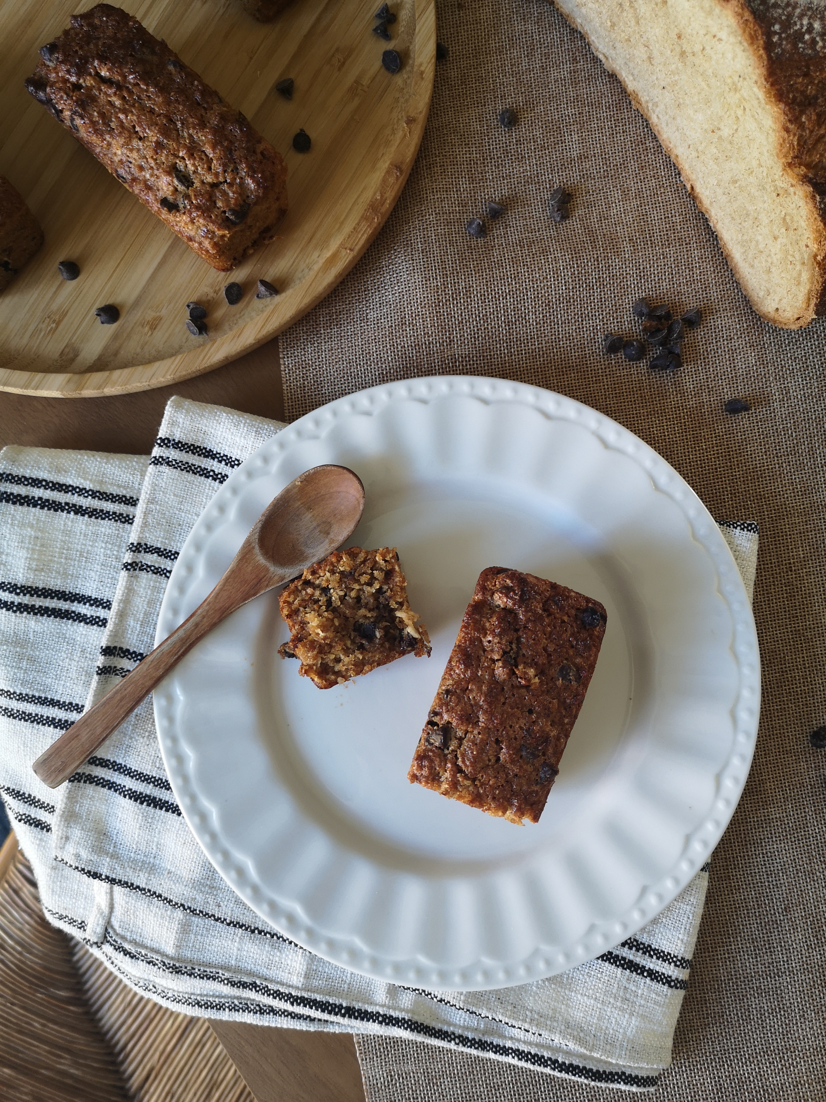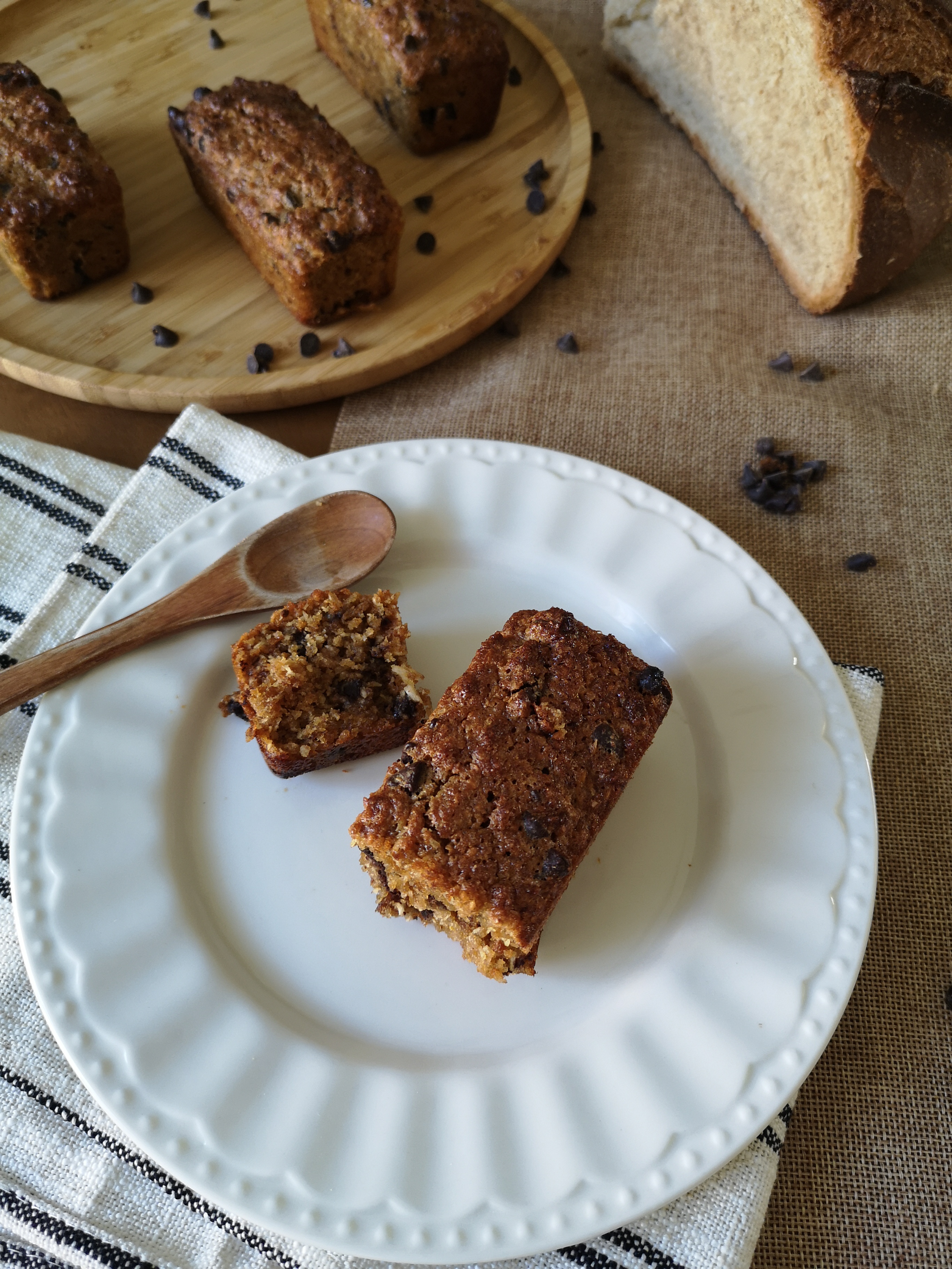 Après la période cookies de pain rassis, j’ai eu envie de changer un peu de registre et préparer des petits cakes de pain rassis à la noix de coco et pépites de chocolat… Trop bon !
