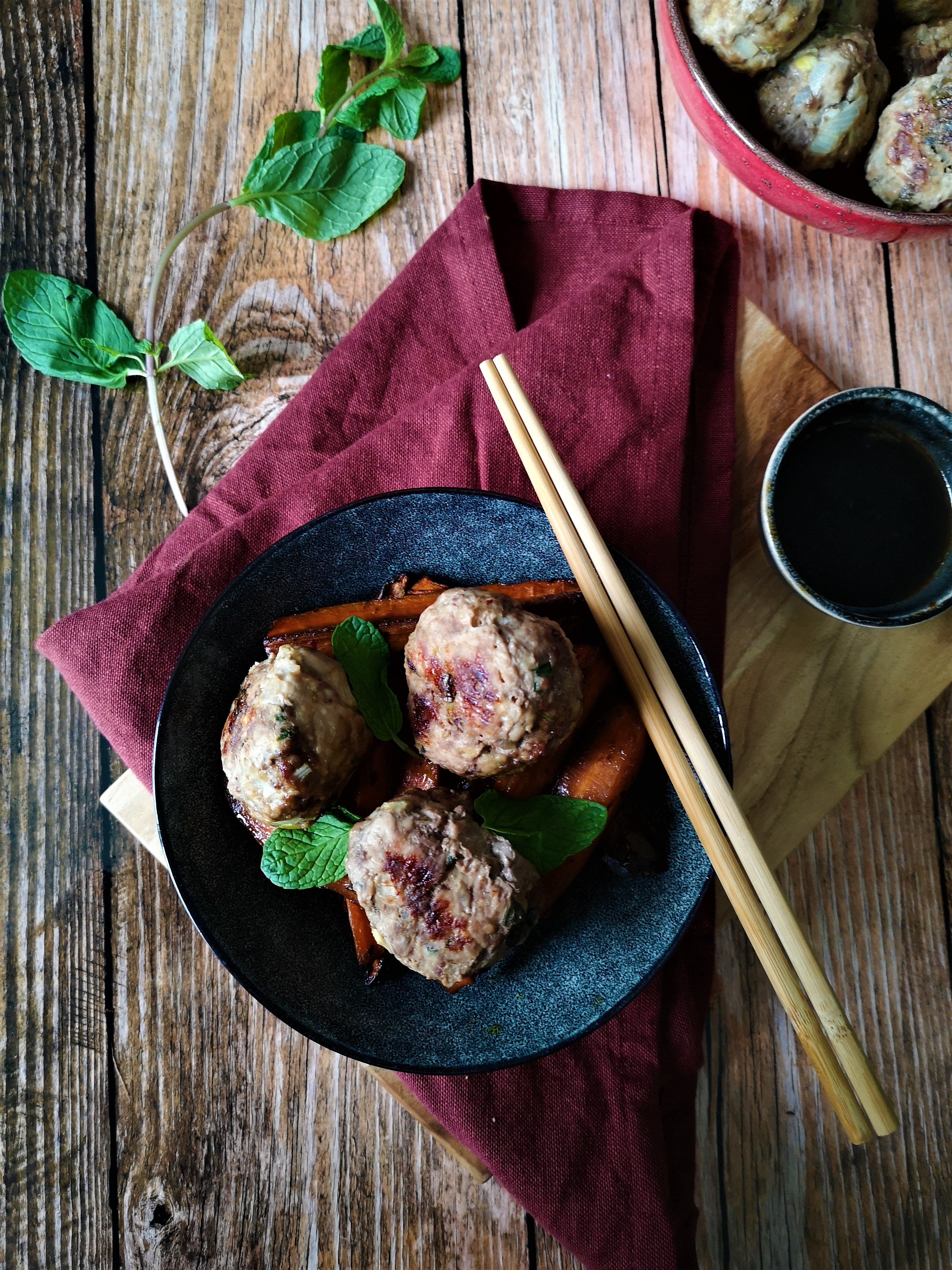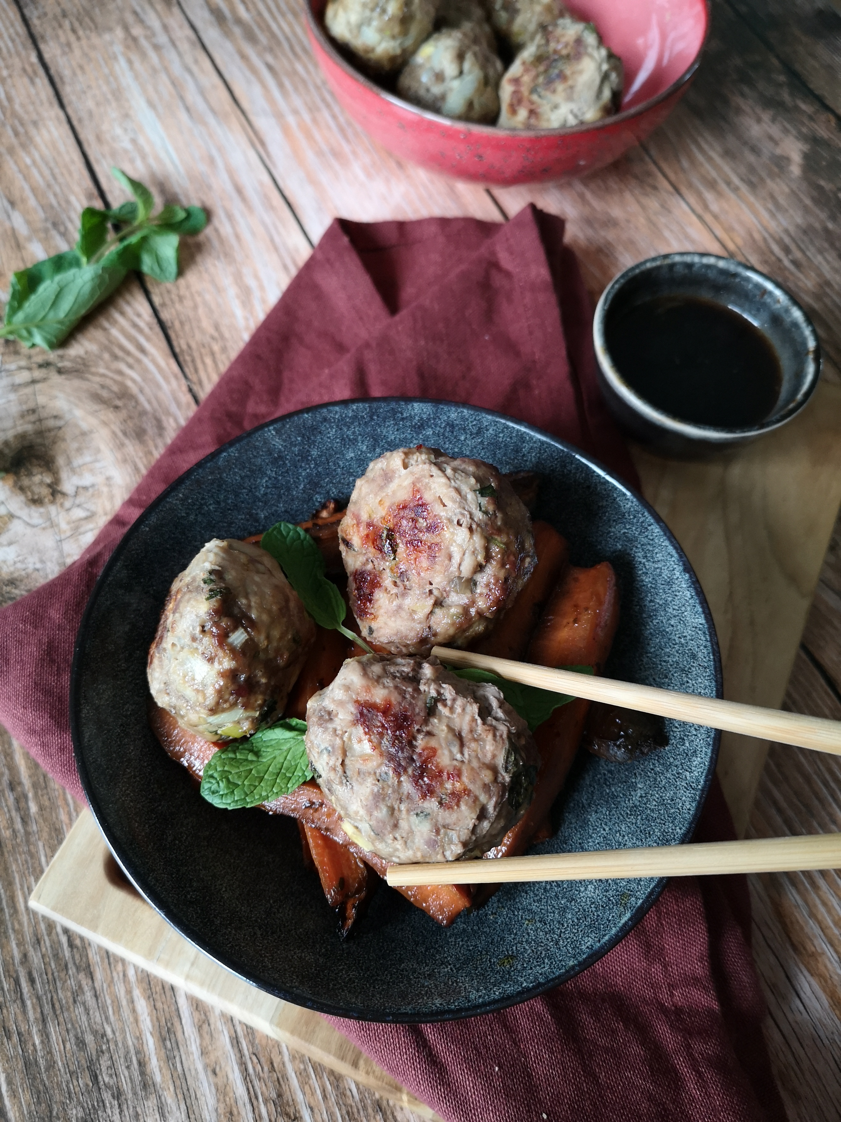 Servir les boulettes de viande sur un lit de riz ou de carottes (ou les deux !) et verser la sauce !