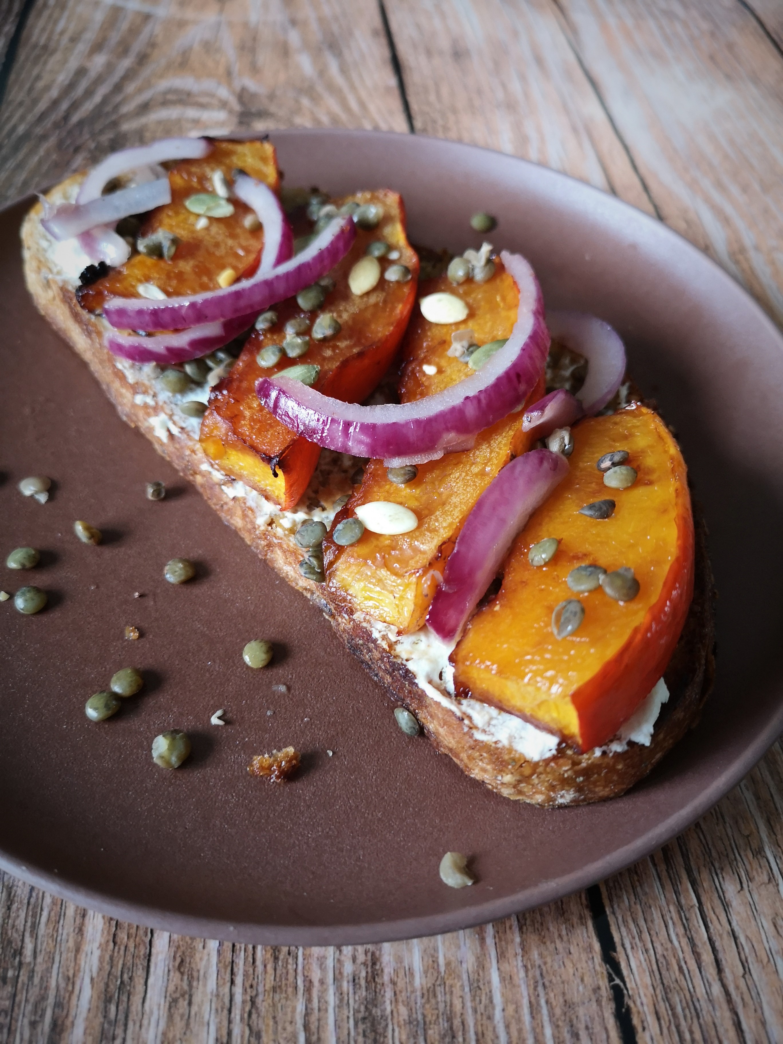 Voici sans plus attendre ma recette de tartine zéro déchet au chèvre, courge et lentilles.