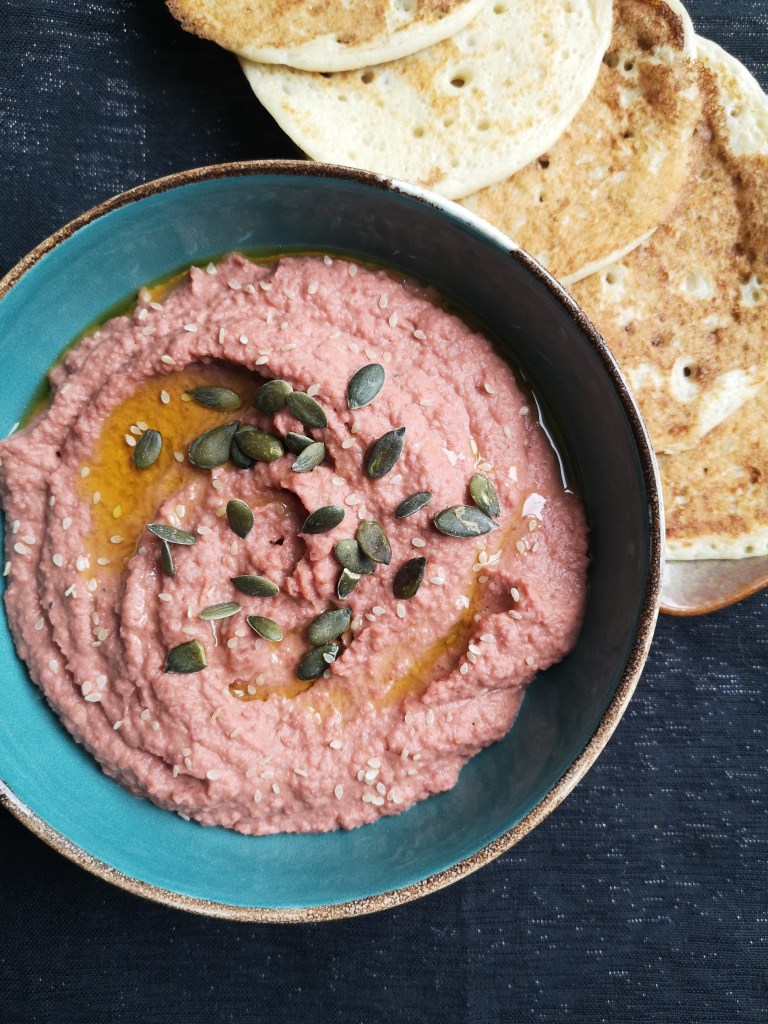 Ça vous tente ? Voici la recette du houmous de betterave, blinis à l’aquafaba.
