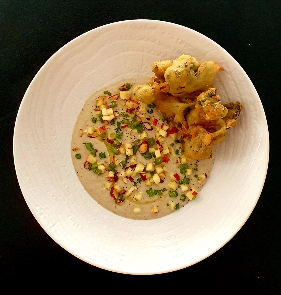 Julien Allano, chef du restaurant étoilé Le Clair de la Plume à Grignan, nous dévoile sa recette de beignets de feuilles de céleri, velouté d’épluchures de céleri.