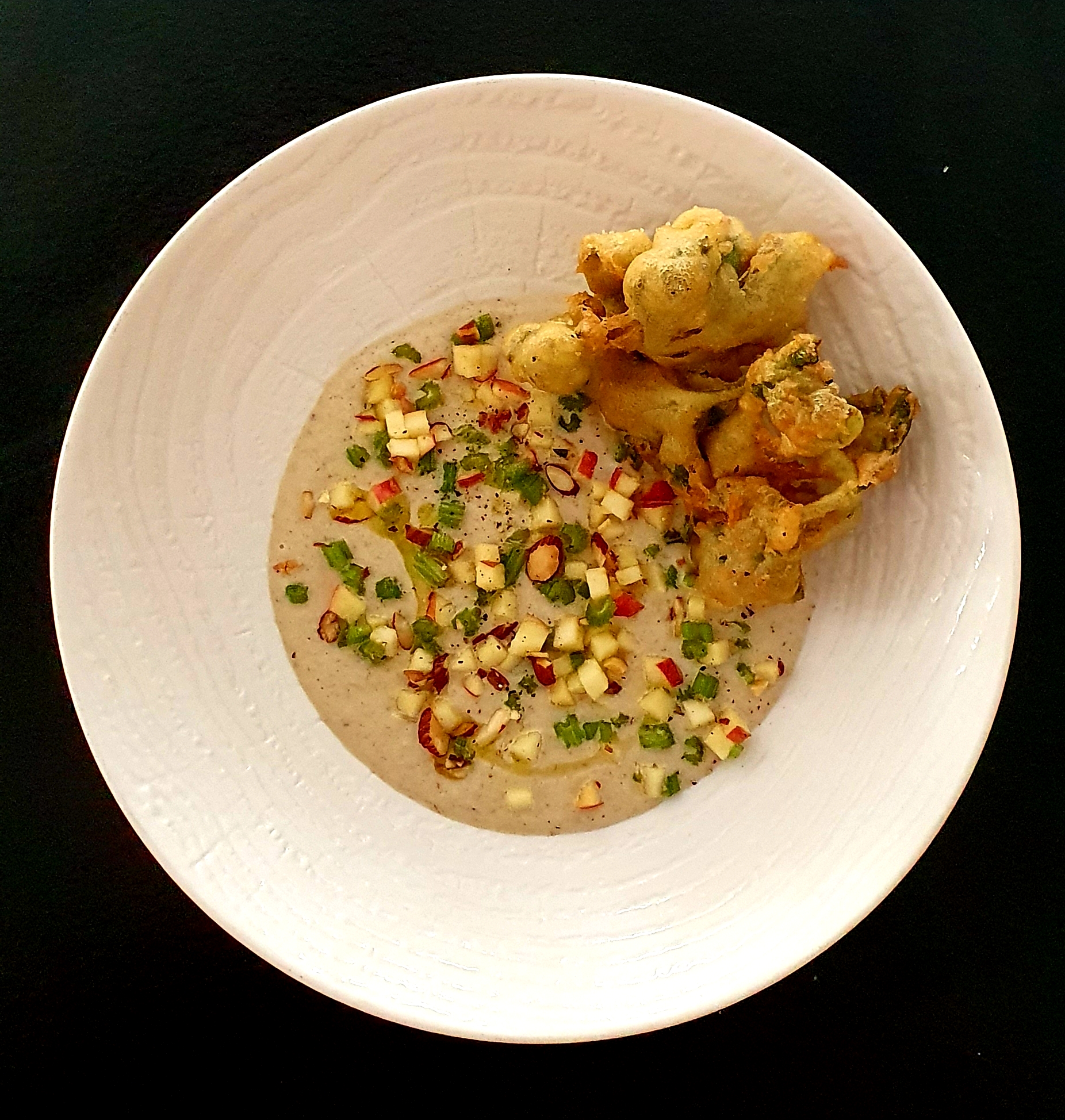 Julien Allano, chef du restaurant étoilé Le Clair de la Plume à Grignan, nous dévoile sa recette de beignets de feuilles de céleri, velouté d’épluchures de céleri.