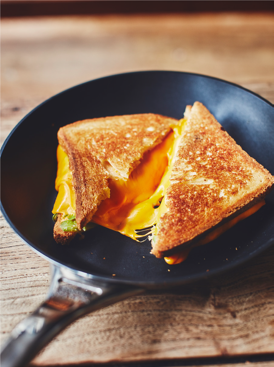 Dans une poêle sur feu moyen, faire griller le grilled cheese 5 minutes de chaque côté.