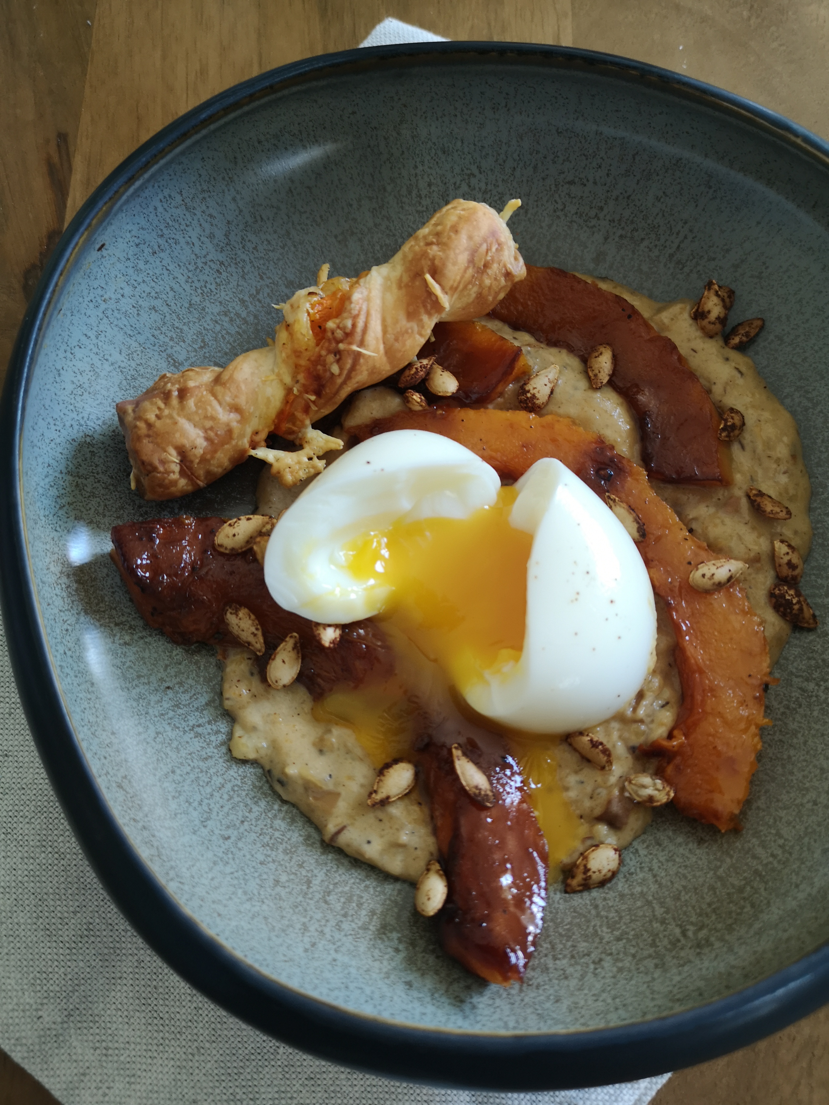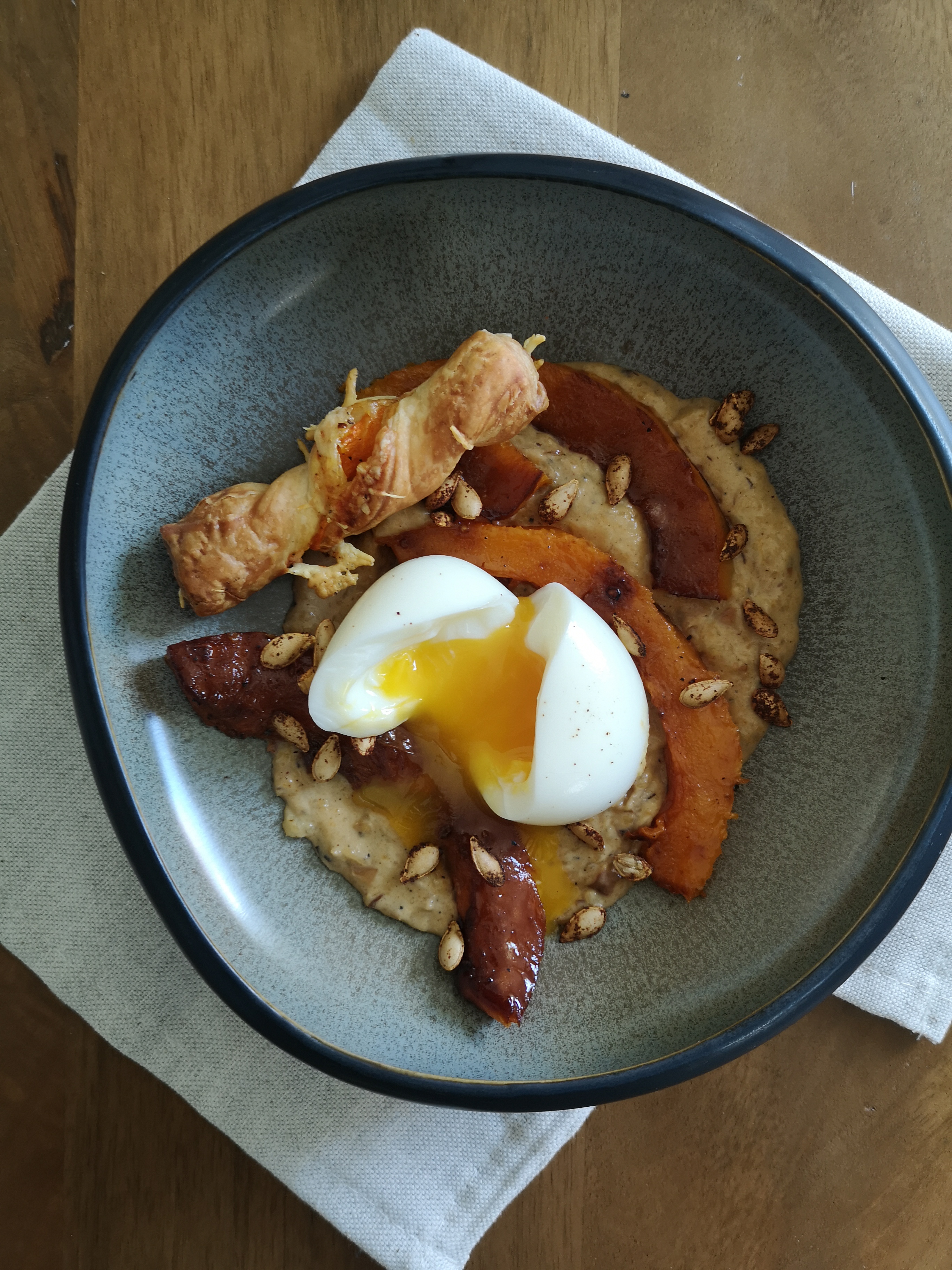 Dans une assiette creuse, déposer 2 belles cuillères de crèmes de peau de butternut. Ajouter par-dessus quelques tranches de butternut rôti, l’oeuf mollet et parsemer de graines de courges. Terminer en déposant le petit feuilleté.