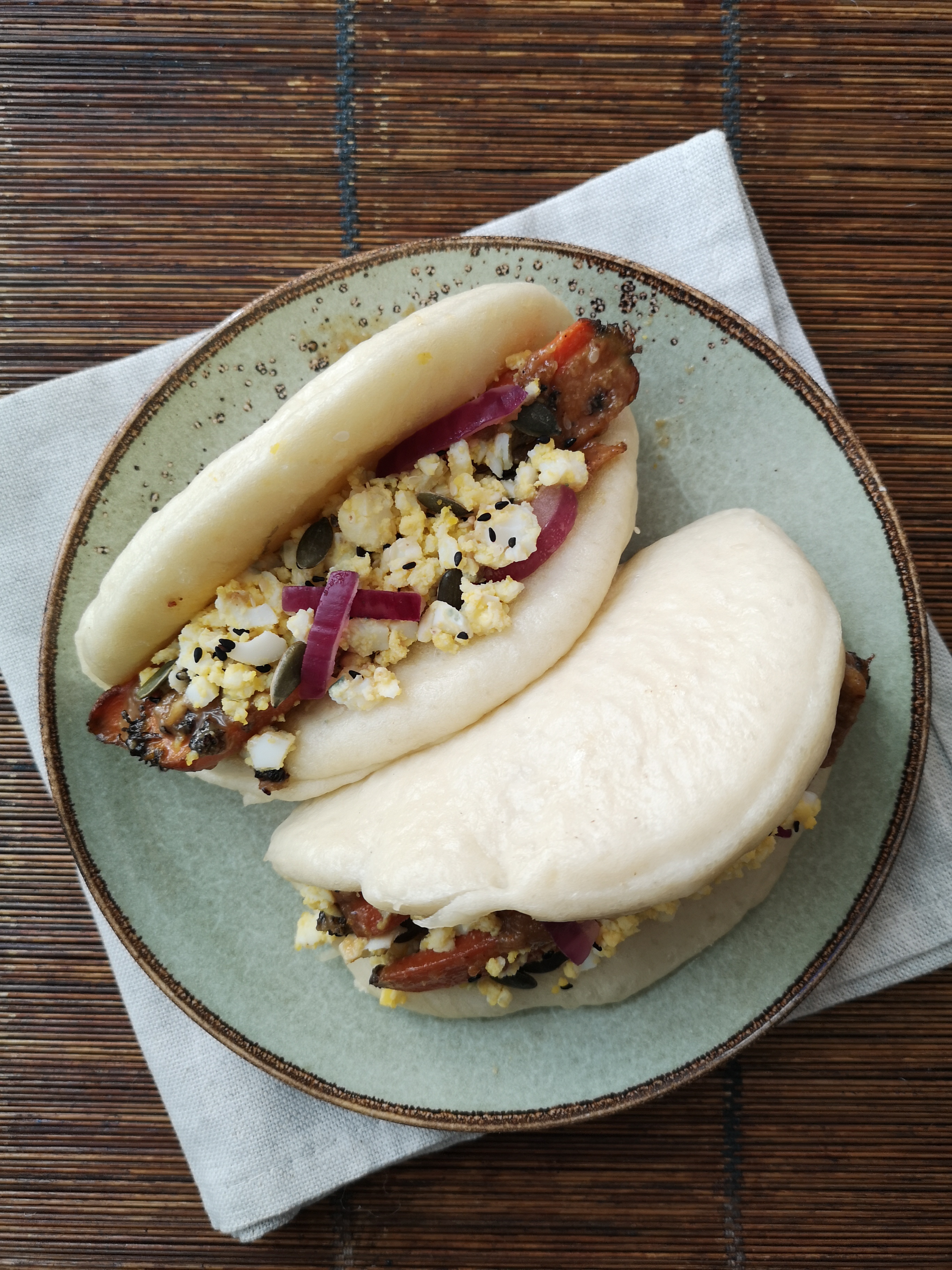 Ouvrir le gua bao, ajouter 2 ou 3 morceaux de carottes, des œufs émiettés, des lamelles d’oignons rouges. Terminer en saupoudrant un peu de graines de sésame et déguster.