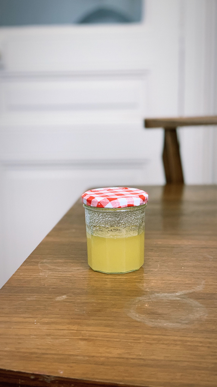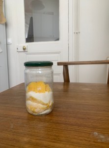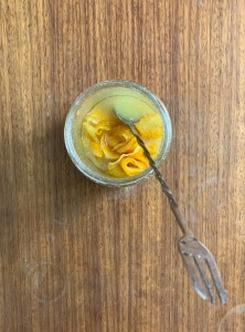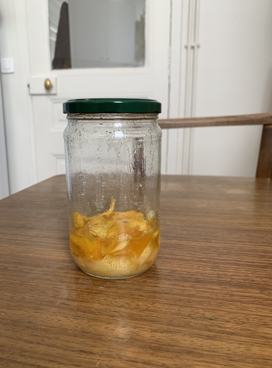 Une fois qu’il ne reste que des zestes fripés et un sirop dans le pot (entre 24 et 48h plus tard), filtrer en veillant à extraire le plus de sirop possible des zestes.