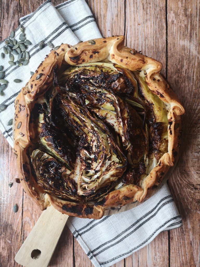 Voici la recette de la tarte de chou pointu au miso, pâte aux graines.