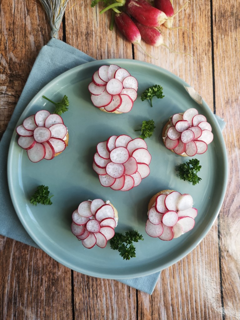 Quand la pâte est refroidie, tartiner avec le mélange au chèvre et déposer les radis en rosace comme sur la photo.