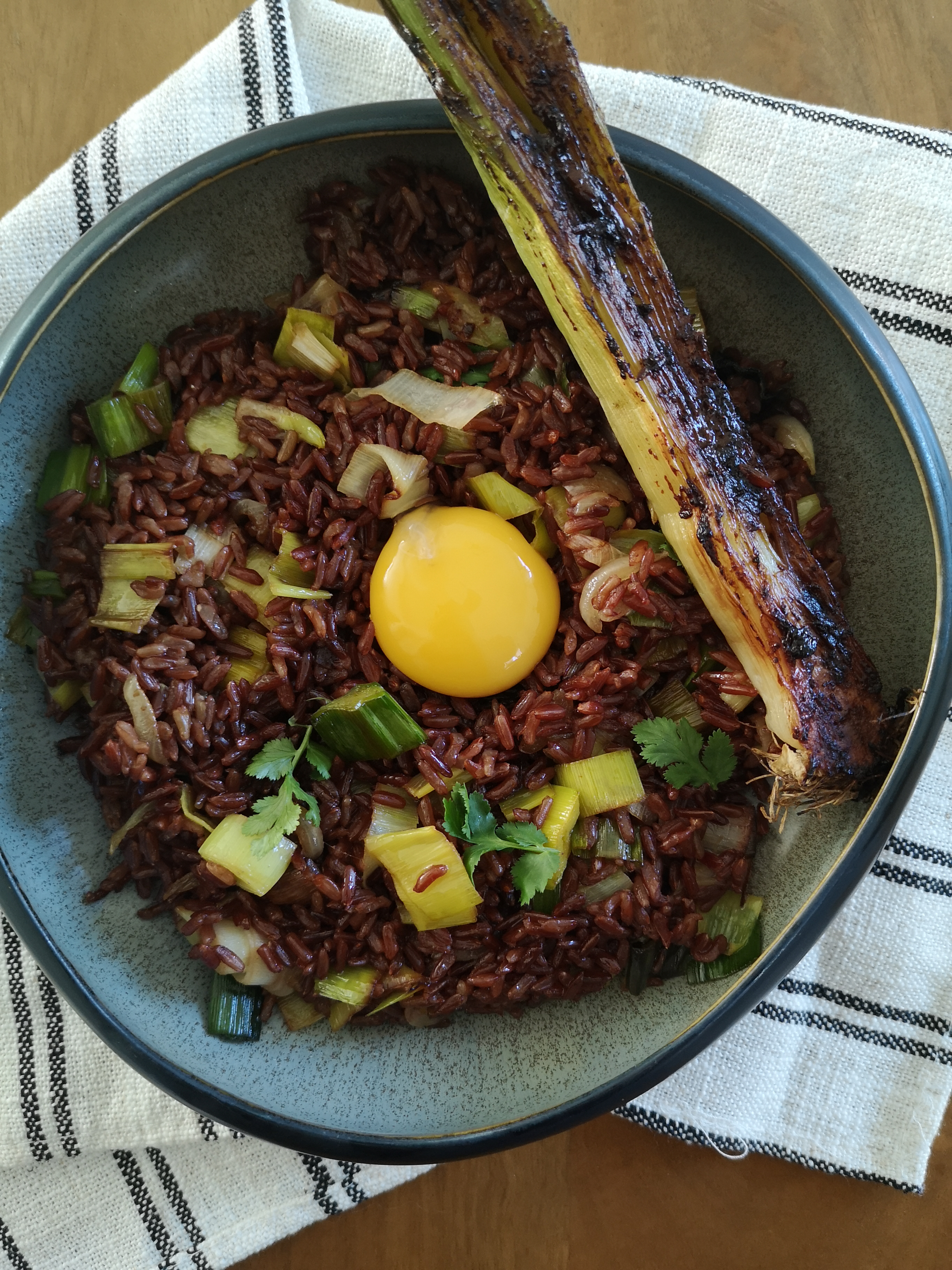 Dans une assiette creuse, déposer le riz frit au poireau, un demi poireau et le jaune d’œuf confit. Décorer avec un peu de coriandre.