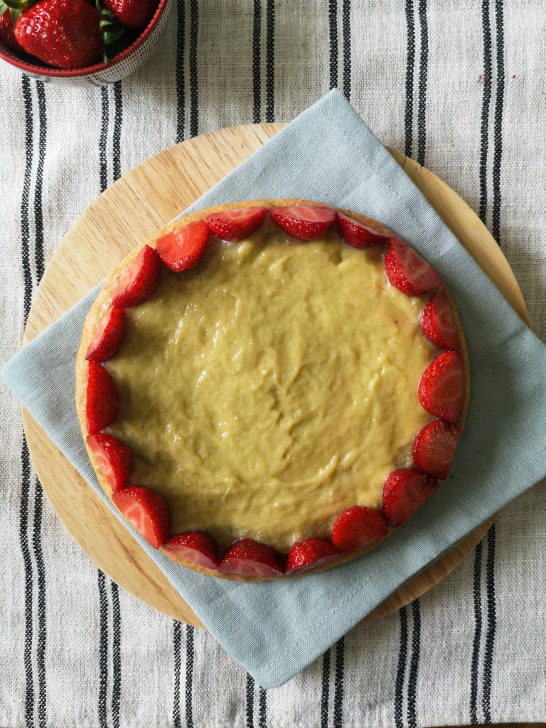 Voici la recette de la tarte aux fraises et curd de rhubarbe.