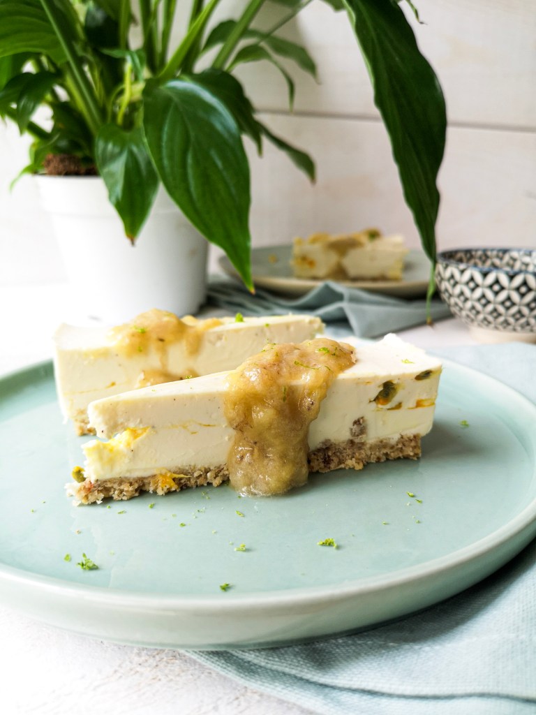 Vous avez réalisé un coulis de banane ? Je vous propose de l’utiliser pour napper un cheesecake à la passion.