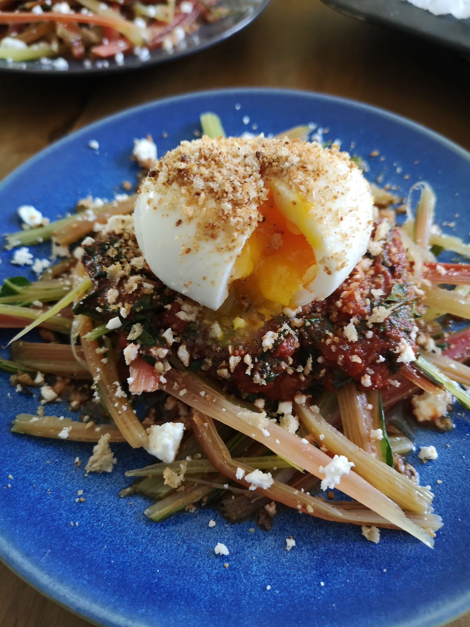 Servir en mettant dans chaque assiette des spaghetti de côtes de blettes, de la sauce par dessus, un peu de feta émiettée et l’œuf mollet au sommet. Finir en saupoudrant de chapelure de pain.