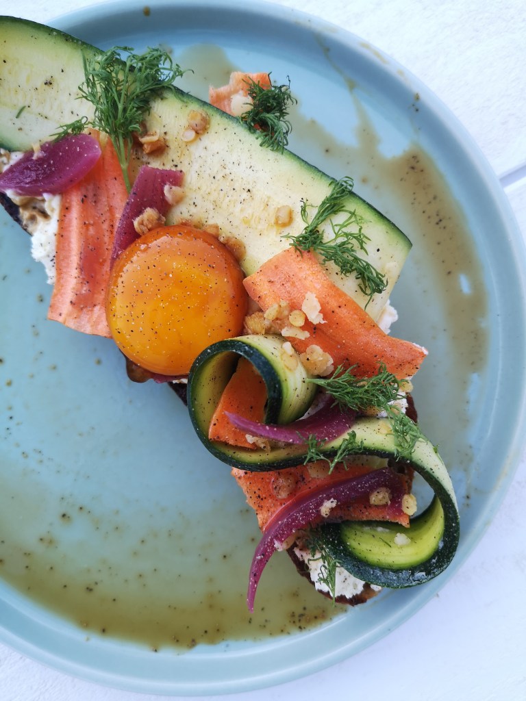 Voici la recette de la tartine de légumes et jaune d’œuf confit au soja.