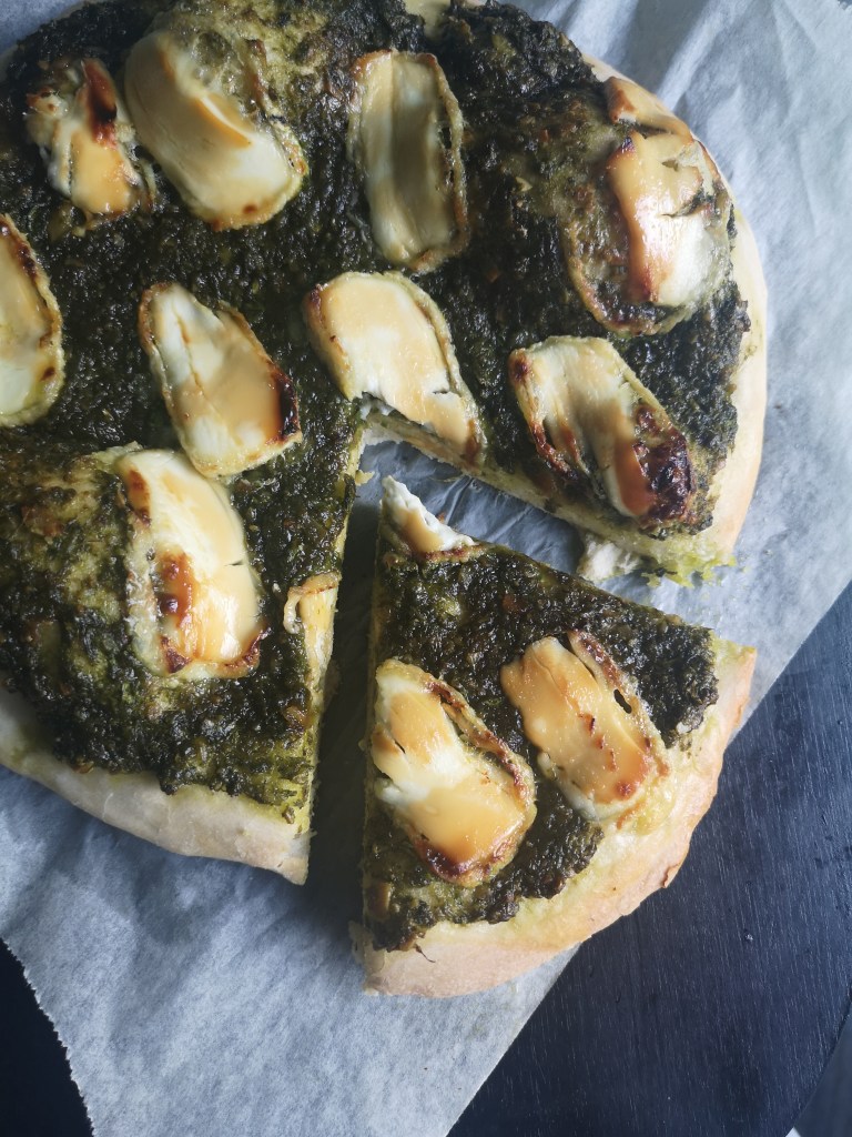 Vous avez préparé un pesto de feuilles de betterave et ne savez pas quoi en faire ? Je vous proposer de simplement l’étaler sur une pâte à pizza et d’y ajouter du chèvre et du miel pour un dîner facile et vraiment délicieux.