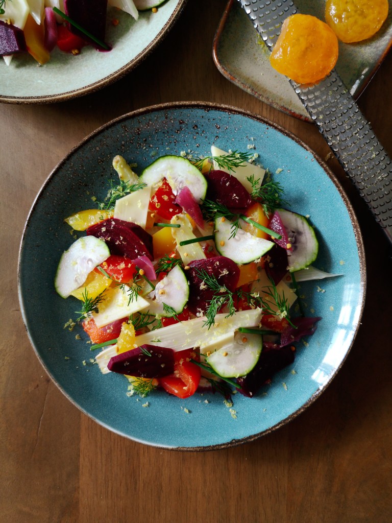 Voici un petit exemple d’utilisation de différents pickles mais aussi des jaunes d’œufs séchés avec cette recette de salade d’asperges et poivrons.
