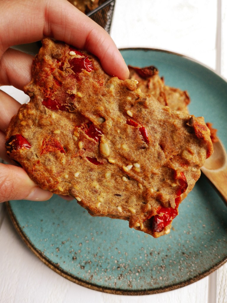Après la focaccia, je vous propose une petite recette de crackers aux graines et peaux de poivrons.