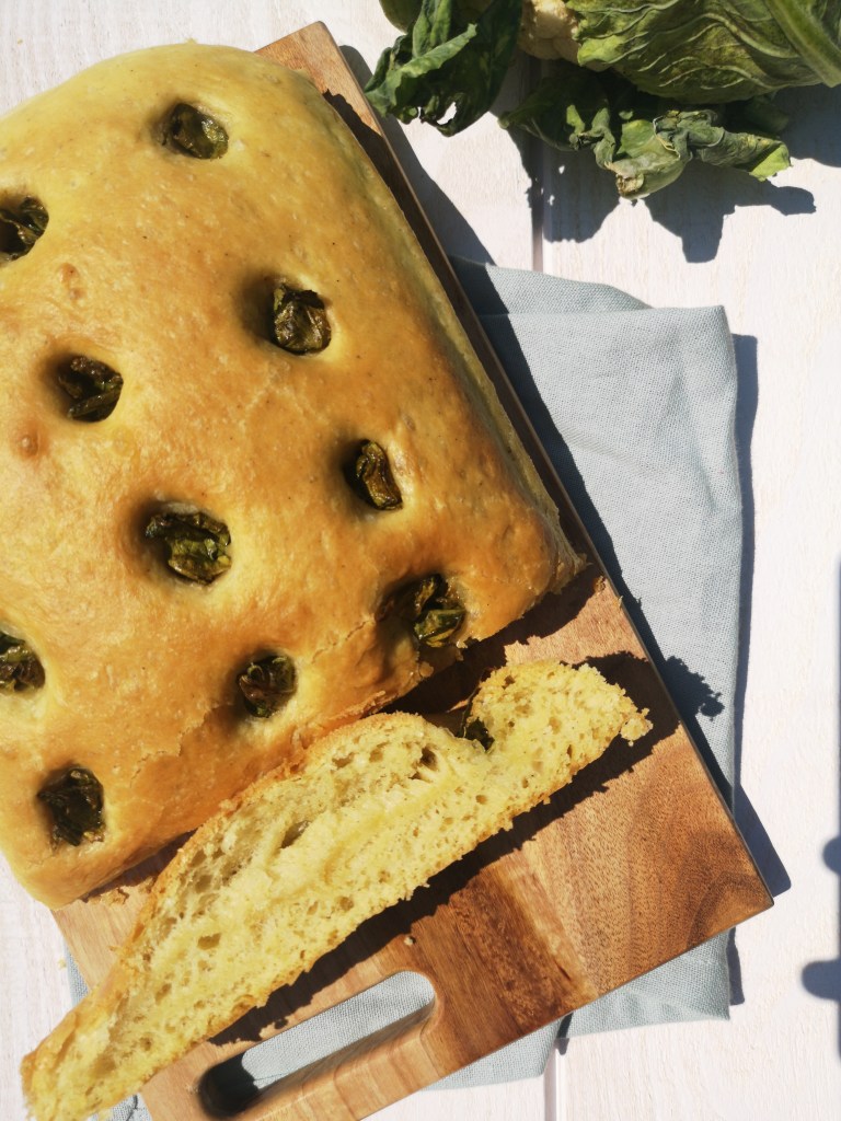 Vous avez fait des feuilles de chou-fleur dont vous ne savez pas quoi faire ? Conservez-les pour garnir une bonne focaccia pour l’apéritif.