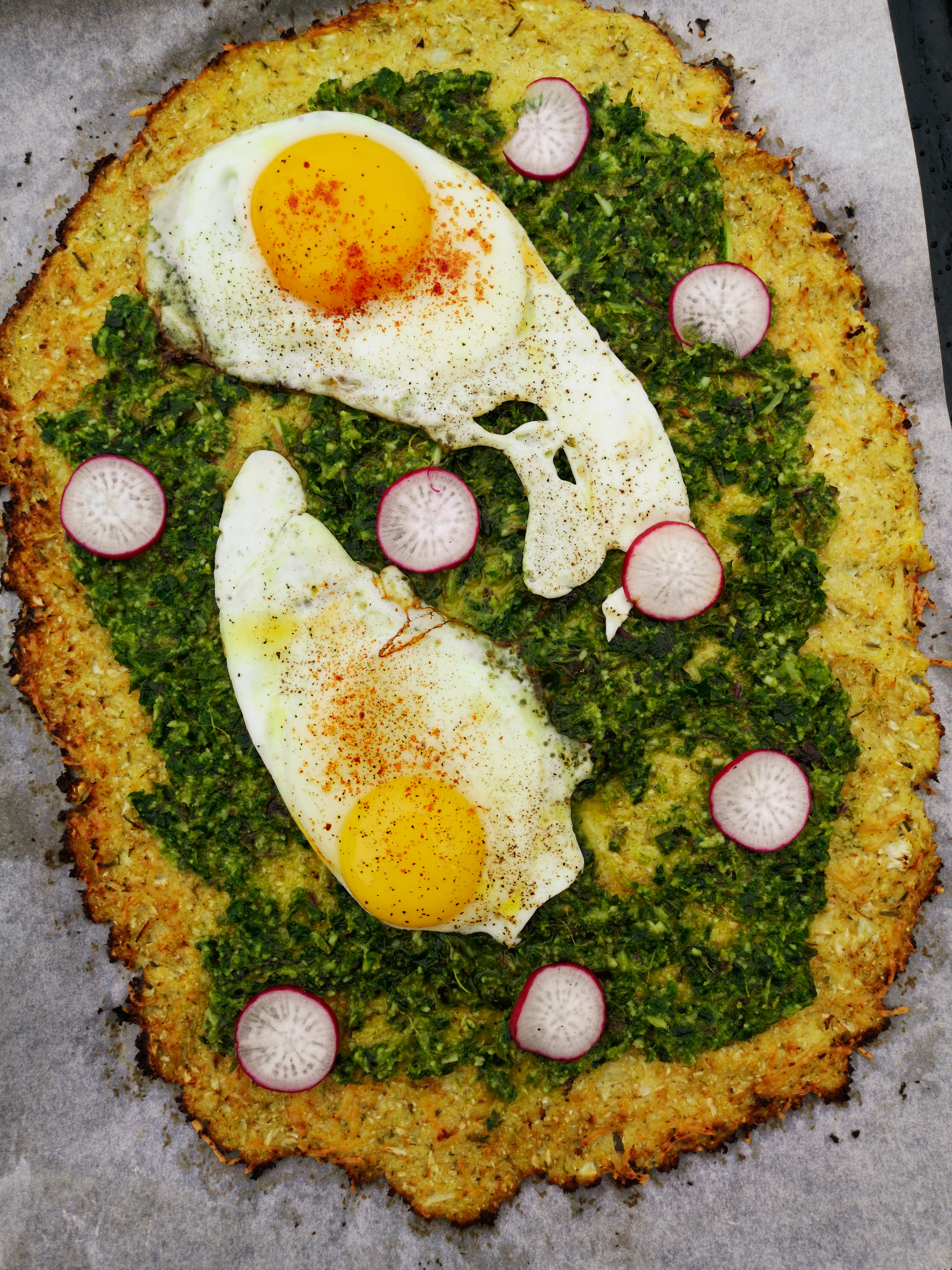 Pizza de chou-fleur, pesto aux feuilles de chou-fleur
