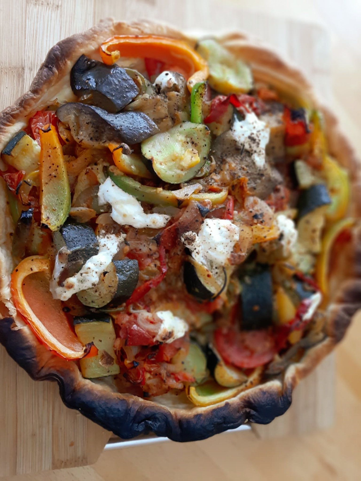 Décidément, ma mère est inspirée en ce moment et m’a envoyé une nouvelle recette anti-gaspi : la tarte aux restes de ratatouille.