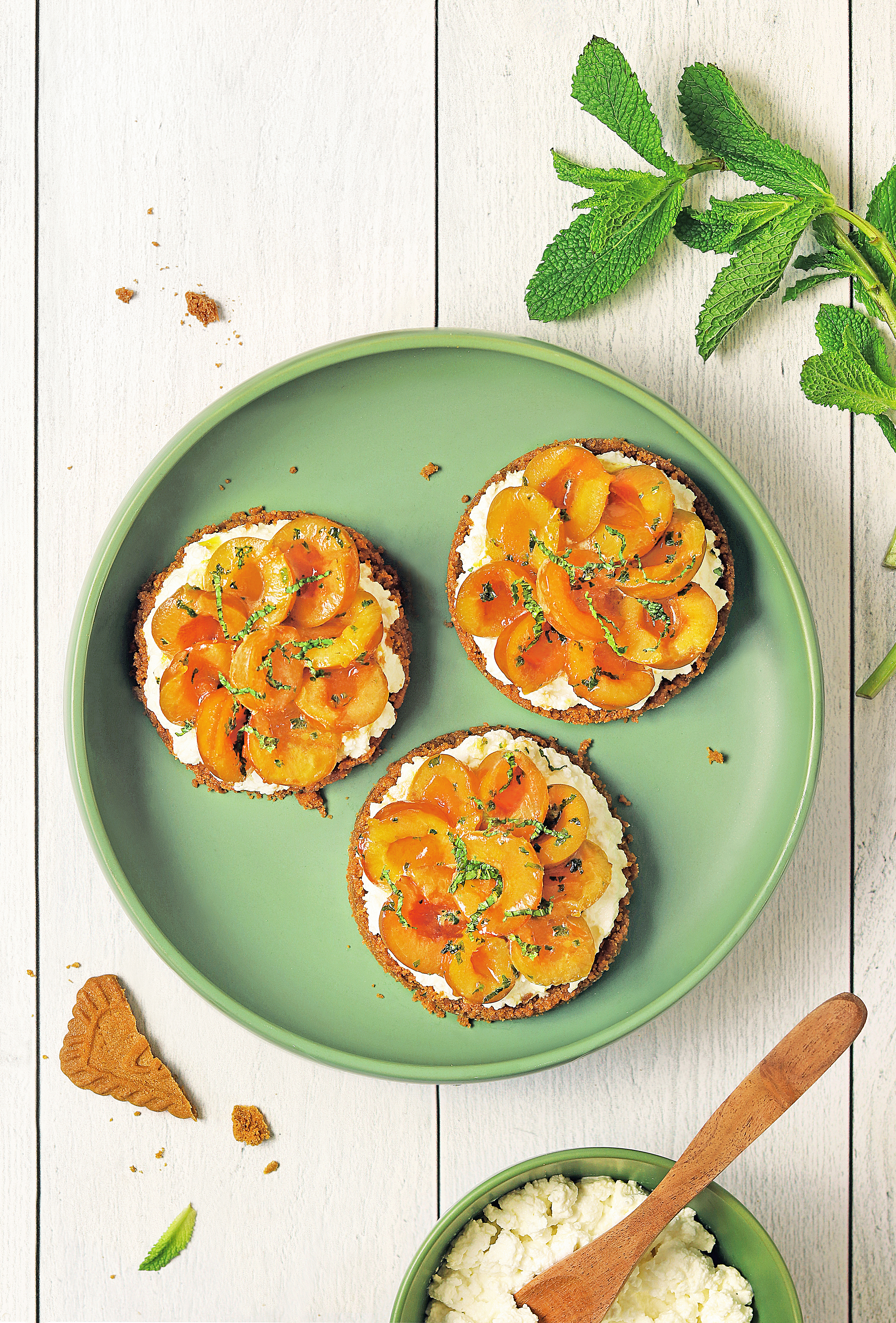 Dressez les oreillons en couronne sur la brousse, parsemez de menthe ciselée et servez les tartelettes encore tièdes.