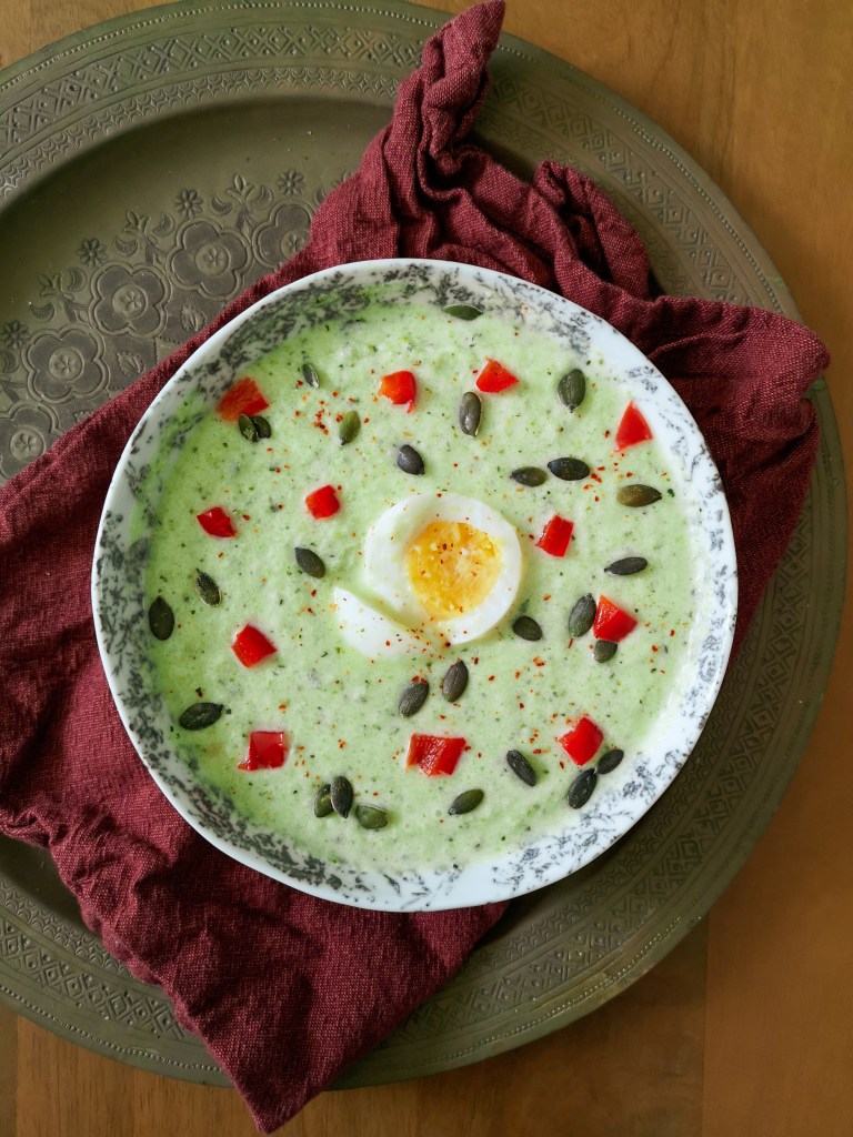 Vous pouvez ajouter dessus quelques croûtons ou pickles (ici j’ai mis des pickles de poivrons) ou même un œuf dur ou mollet.