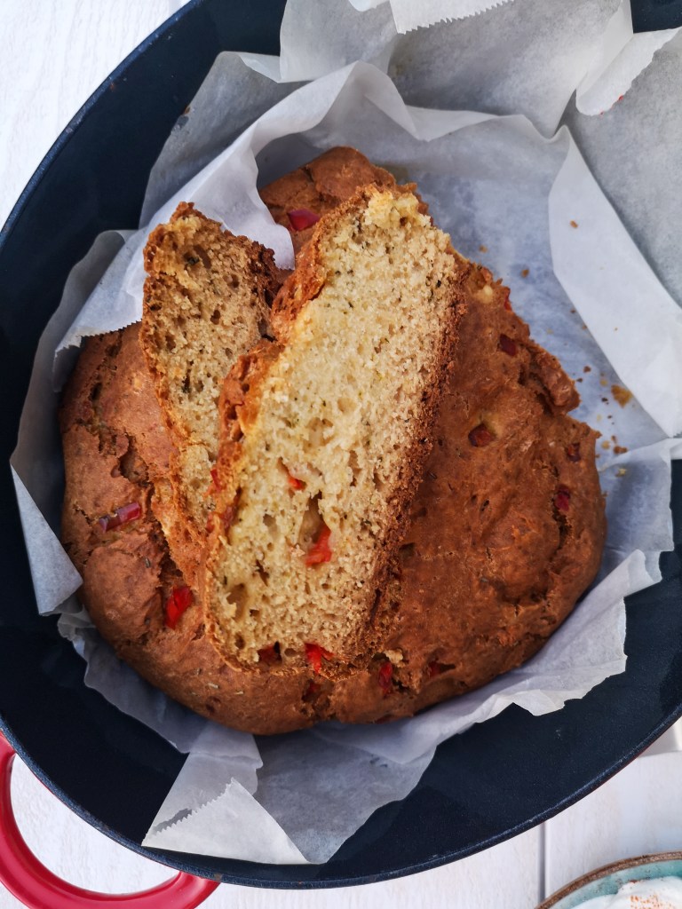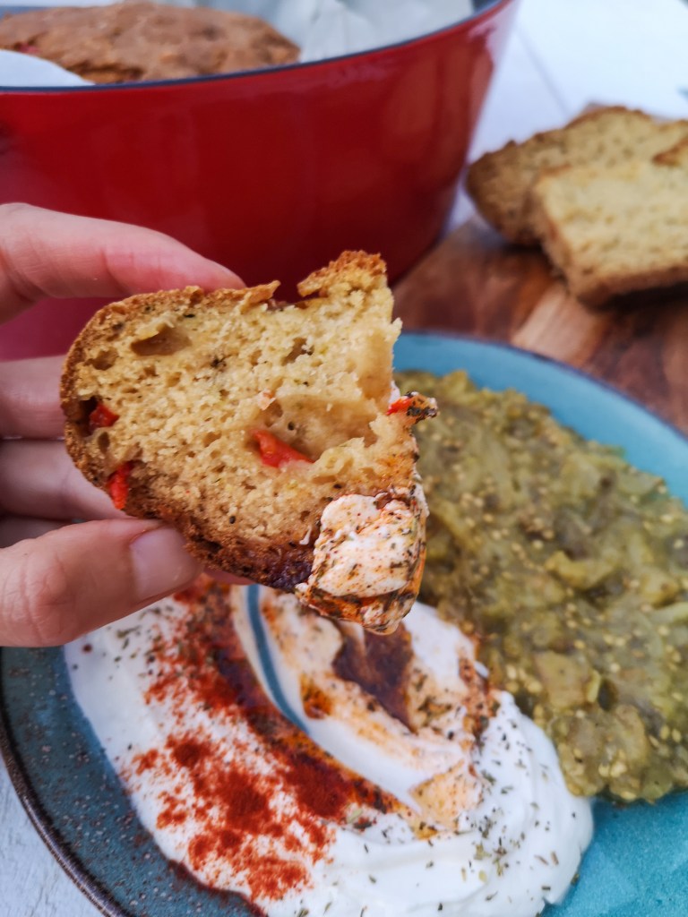 Après la focaccia aux peaux de poivrons, je vous propose de varier les plaisirs avec un pain tout aussi gourmand aux peaux de poivrons et feta, à utiliser comme mouillette dans un œuf à la coque ou bien pour « diper » du labneh, du caviar d’aubergine ou encore du houmous.