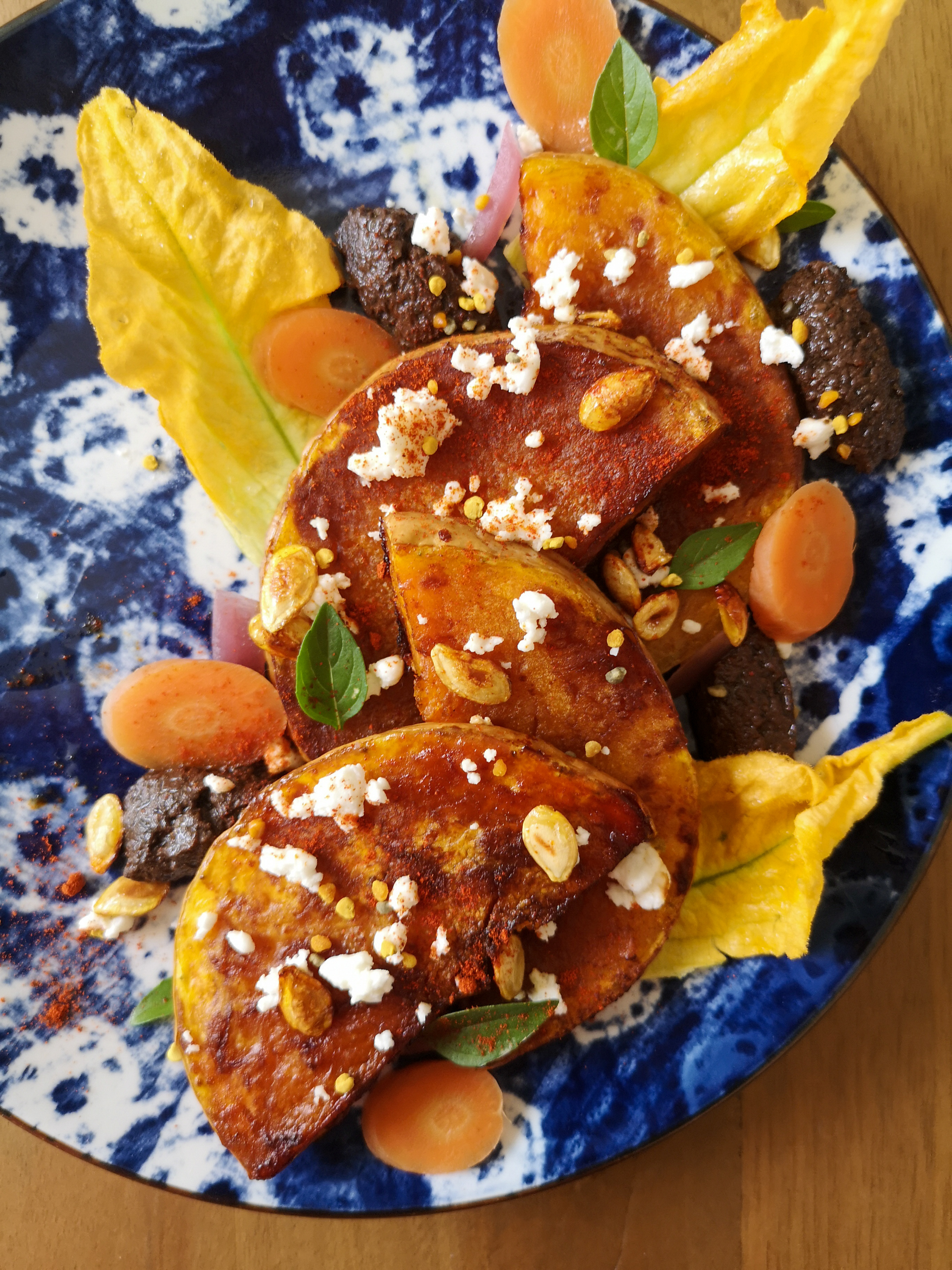 Sur une assiette, dresser quelques tranches de butternut, des cuillères de tapenade, un peu de feta émiettée, des rondelles de carottes fermentées, des pickles d’oignons rouges, des pétales de fleurs de courgettes lavés, quelques feuilles de basilic, de graines de courge torréfiées et saupoudrer le tout avec un peu de paprika fumé.