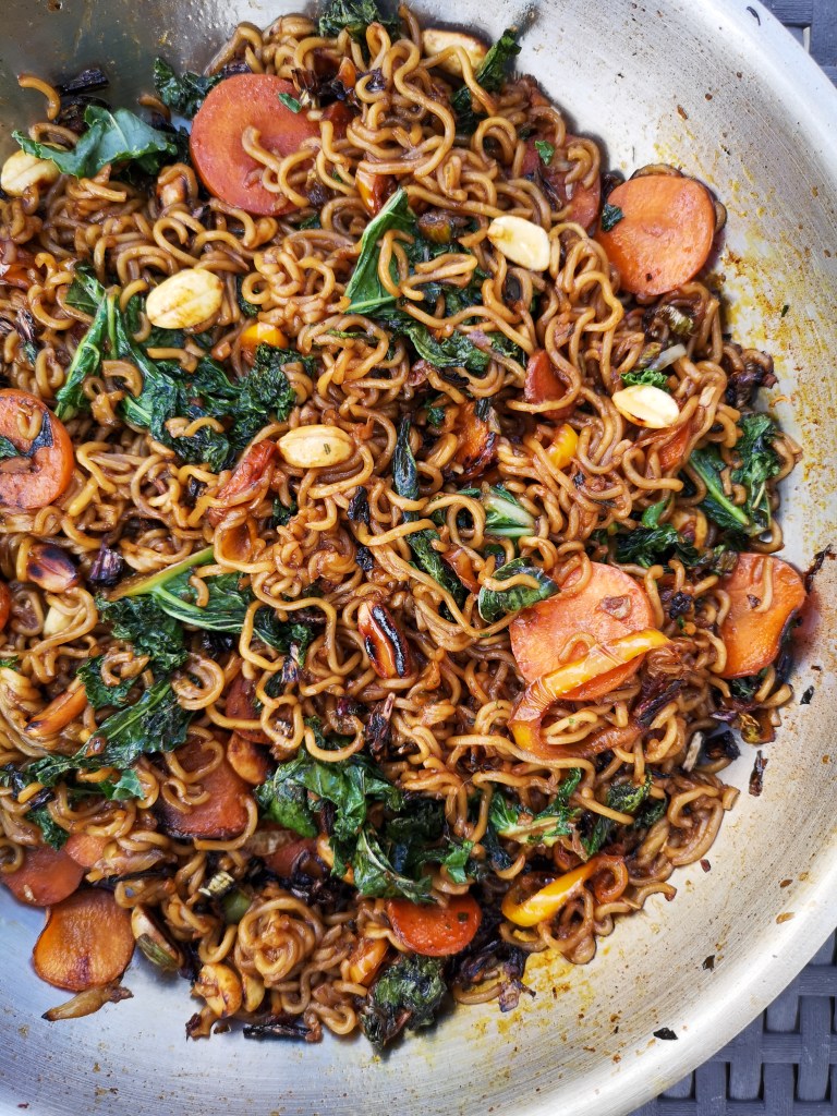 Ajouter le chou kale et bien mélanger le tout. Déglacer avec un peu de sauce soja et le jus d’un citron vert.