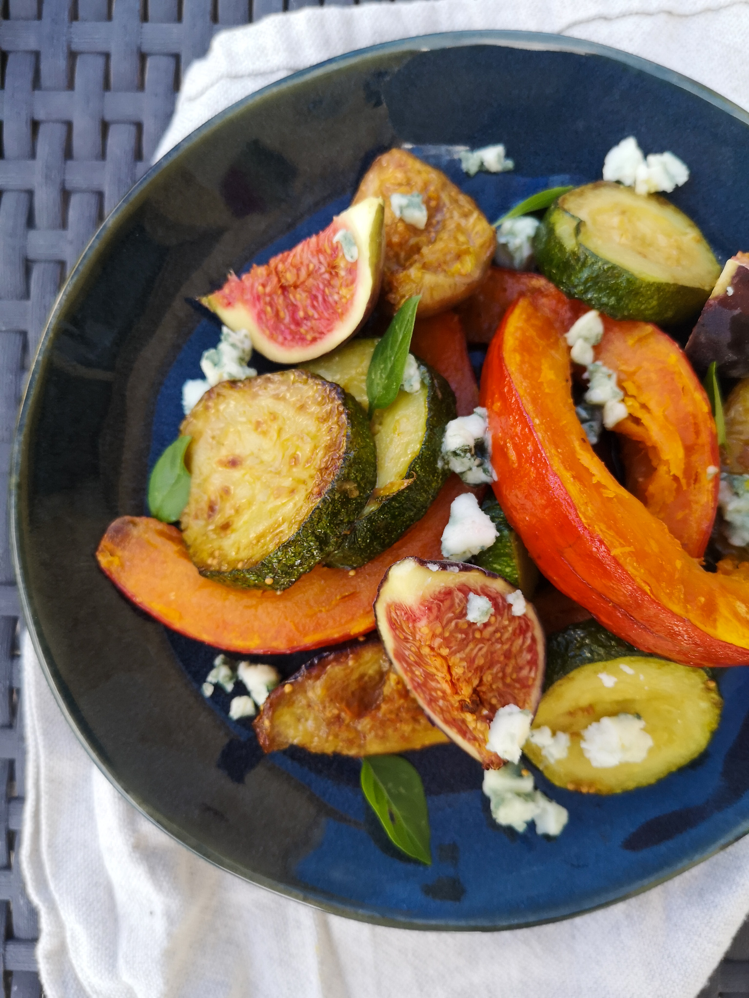 Mélanger le potimarron, les courgettes et les figues. Ajouter les 2 figues restantes lavées et coupées en 4. Ajouter quelques feuilles de basilic et des petits morceaux de Roquefort.