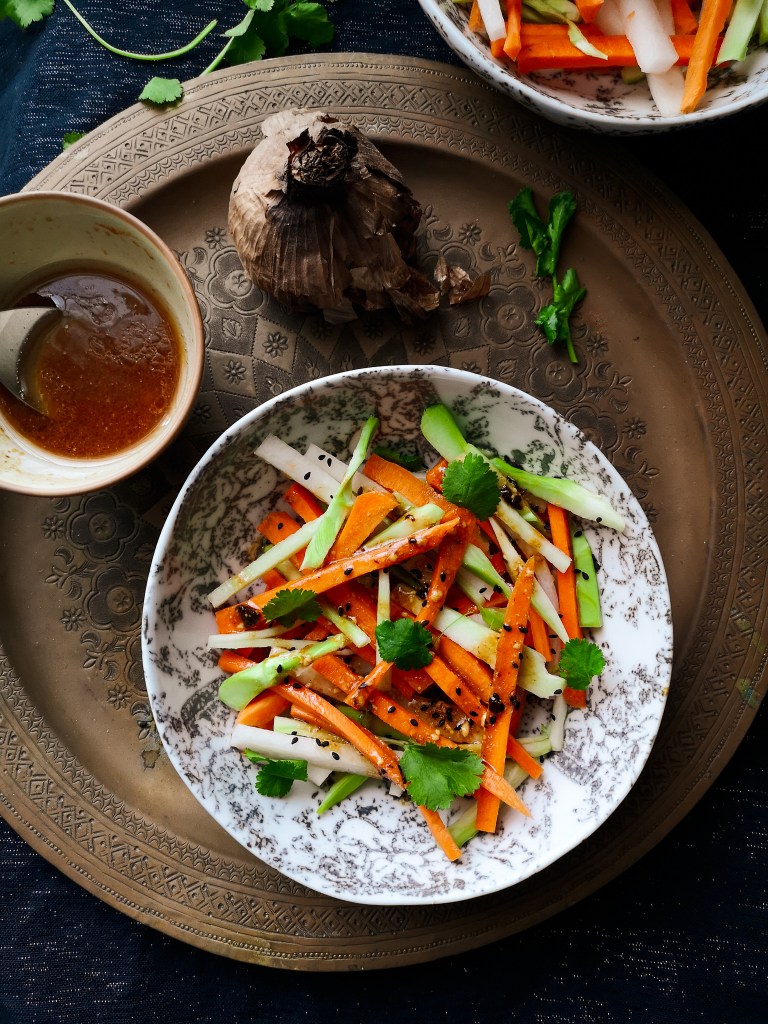 Vous ne savez pas comment cuisiner les tiges de brocoli ? Après la soupe aux tiges de brocoli, je vous propose une recette simple de salade de carottes, tiges de brocoli et radis blanc, assaisonnée avec une super vinaigrette !