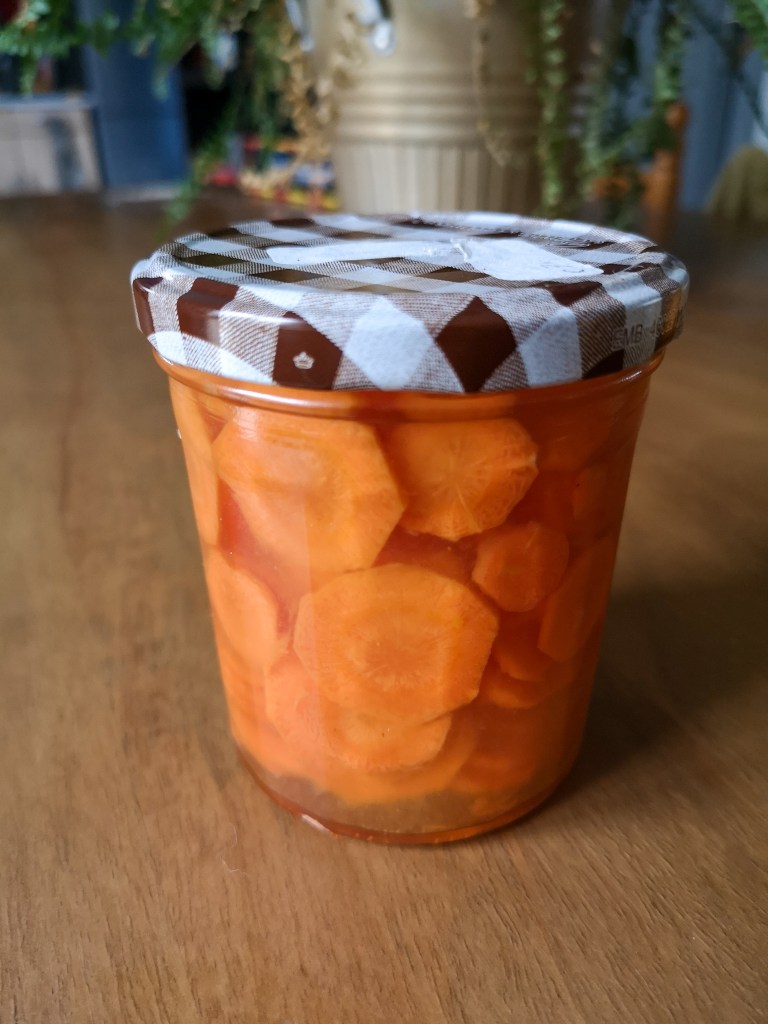 Remplir un pot à confiture avec les carottes et le gingembre en couches alternées. Verser le liquide chaud par-dessus et fermer. Toutes les carottes doivent être bien recouvertes.