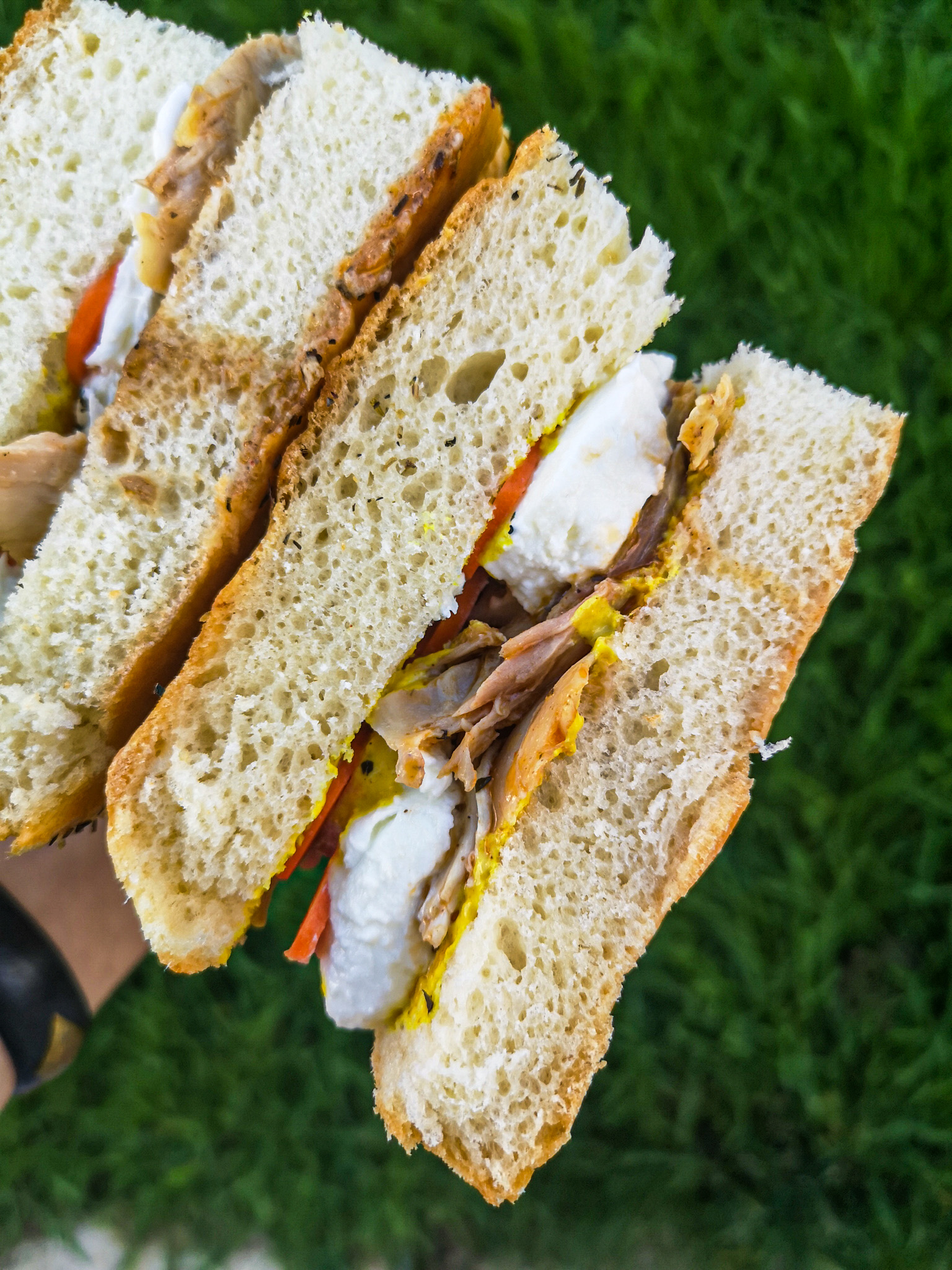 Couper la focaccia en 4. Ouvrir chaque pain en deux et badigeonner avec la moutarde au curry. Déposer du poulet rôti, ajouter un peu de mozzarella coupé en tranches et des pickles de carottes.