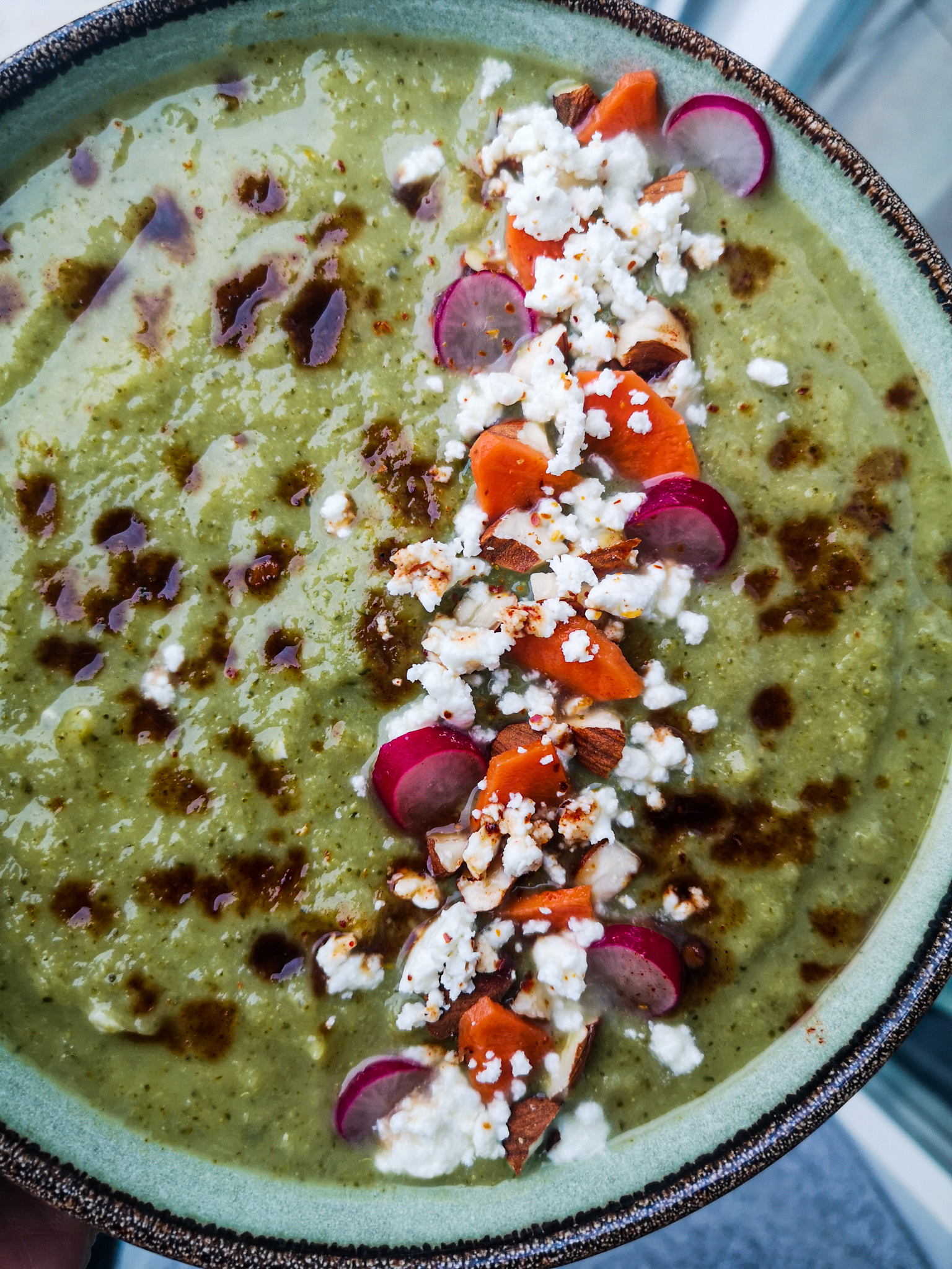 Servir dans une assiette creuse avec un topping. Ici : feta émiettée, pickles de carottes, radis en rondelles, touches de balsamique et épices.