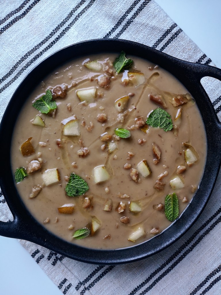 Servir et ajouter quelques dés de poires et des morceaux de châtaignes pour apporter de la texture.