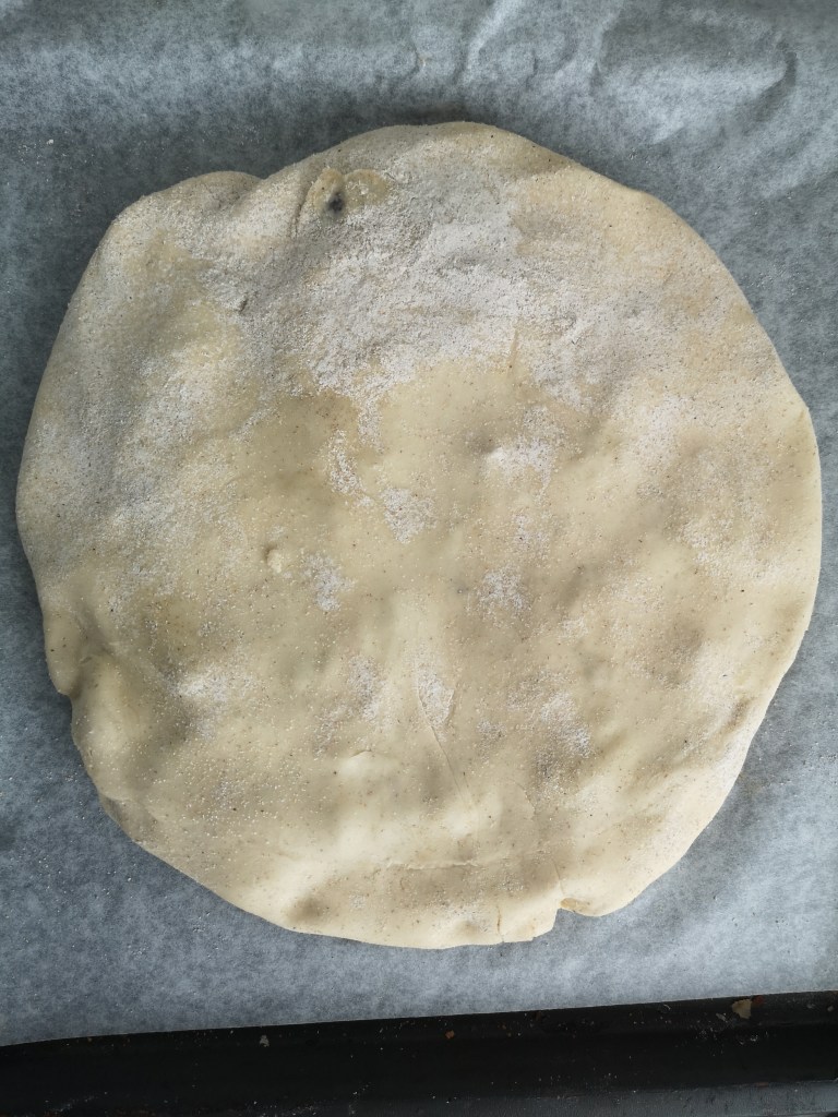 Étaler la pâte le plus finement possible et la déposer par-dessus. Rabattre les bords à l’intérieur.