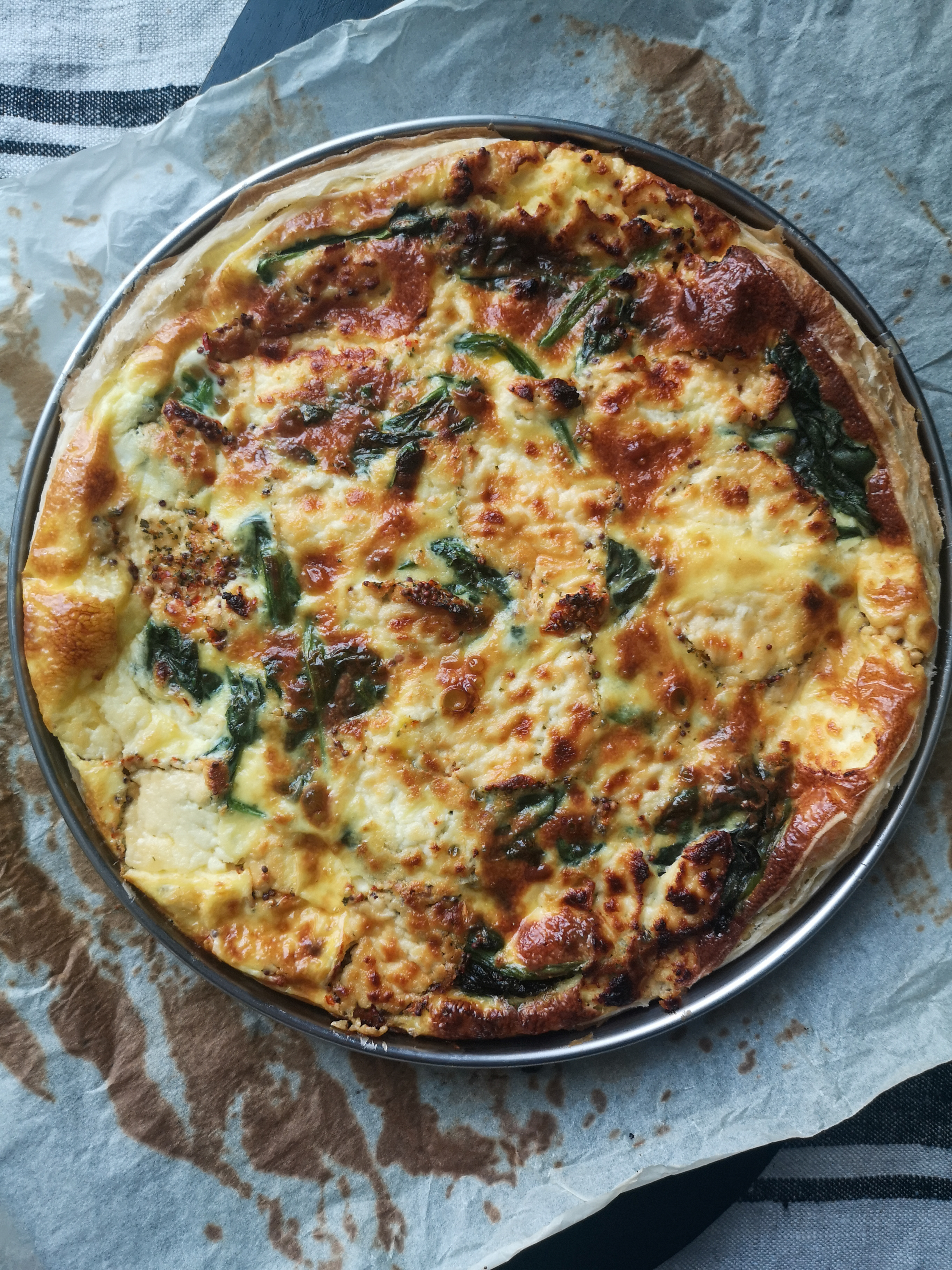 Dérouler la pâte feuilletée dans un cercle beurré. Piquer la pâte et la badigeonner de moutarde aux algues. Déposer par-dessus la tombée d’épinards.