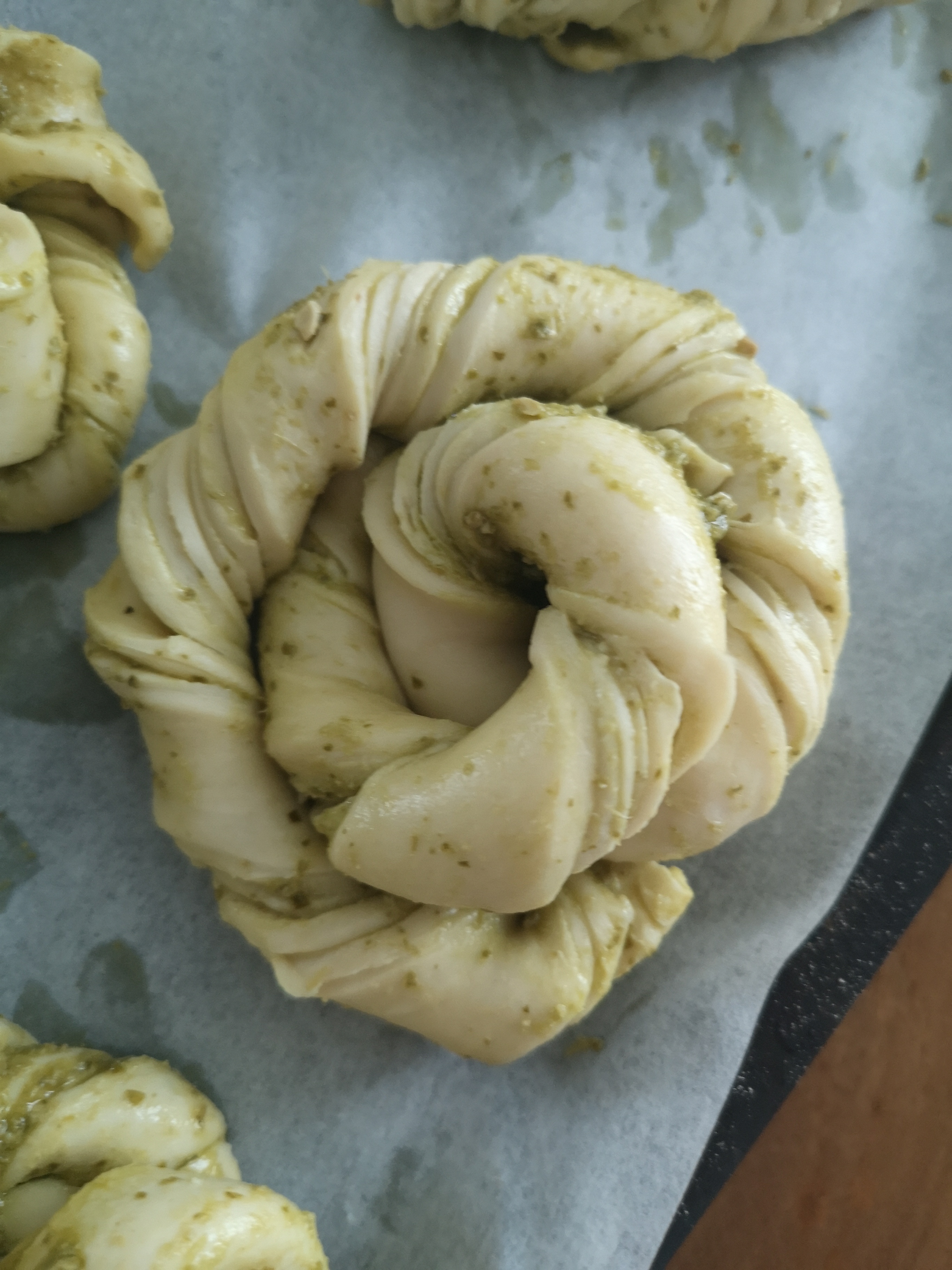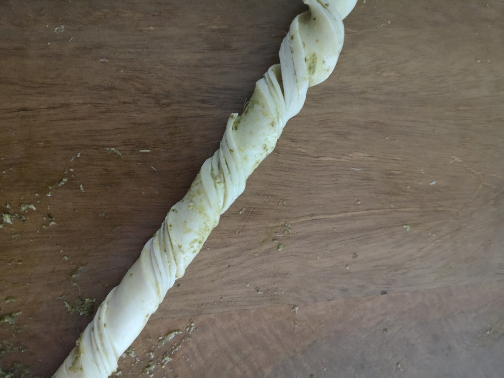 Dégazer la pâte et l’étaler en rectangle. Étaler le pesto sur les 2/3 de la pâte. Plier la pâte en trois comme sur les photos ci-dessous et étaler à nouveau – attention à ne pas trop garnir de pesto sinon tout la sauce va sortir en étalant la pâte.