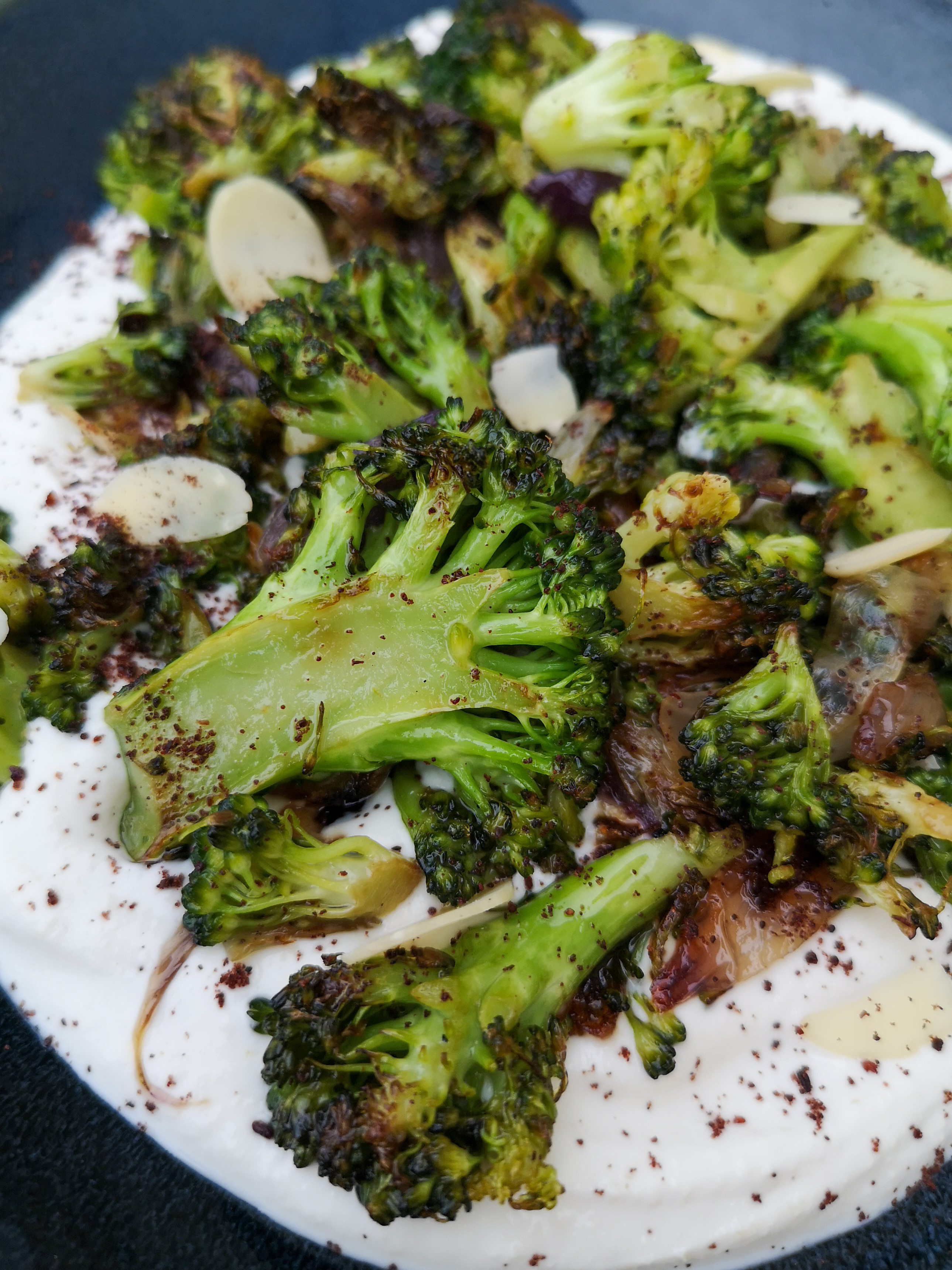 Déposer deux belles cuillères de sauce dans une assiette, déposer dessus le brocolis, parsemer d’amandes grillées, d’herbes aromatiques et de sumac.
