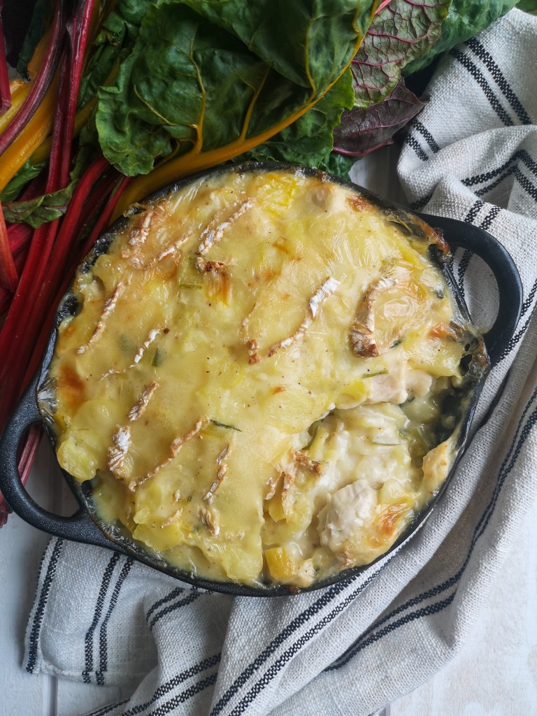 Placer les côtes de blettes et les pommes de terre dans un petit plat à gratin. Couper le poulet en morceaux et l’ajouter. Verser la béchamel et mélanger le tout. Ajouter le camembert coupé en lamelles par-dessus et enfourner 15 minutes.
