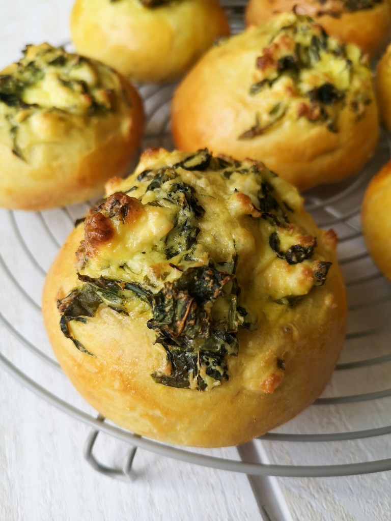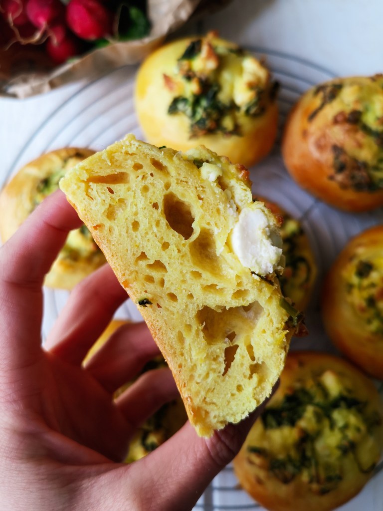 Faire un creux dans chaque pâton et y déposer le mélange fanes de radis/feta. Badigeonner le pain avec le jaune d’oeuf restant.