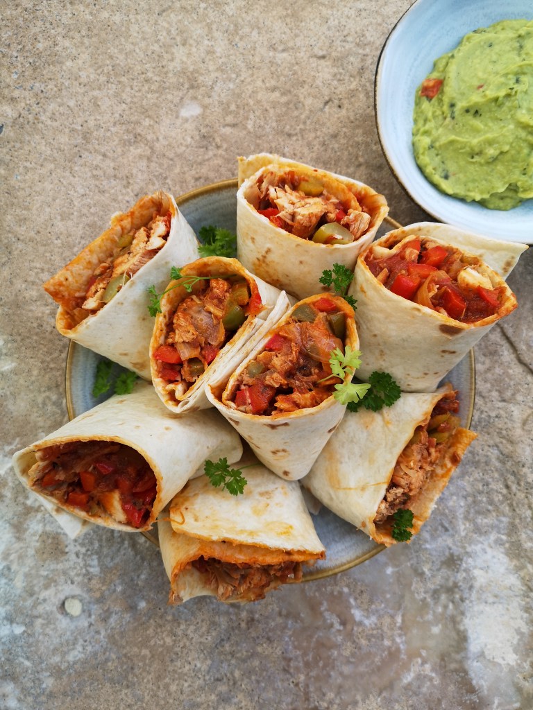 Chauffer les tortillas au micro-ondes ou au four. Les garnir avec le mélange au poulet, ajouter un peu de fromage râpé et rouler les tortillas. Servir avec un bon guacamole.