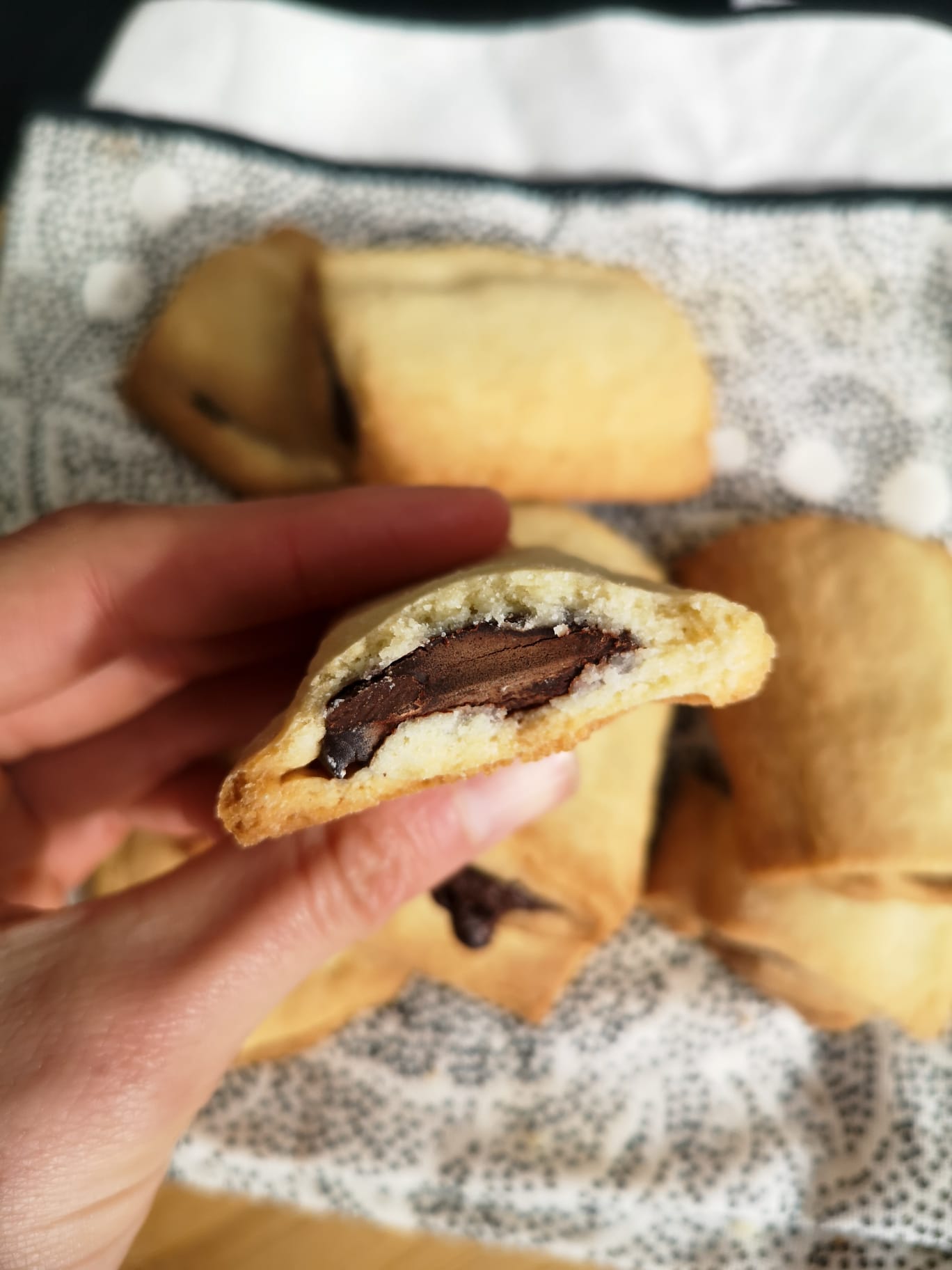 Etaler la pâte en rectangle sur 3 mm d’épaisseur. Couper des petits rectangles d’environ 9 cm sur 7 cm. Placer les morceaux de chocolat au centre, replier les bords en chevauchant légèrement et retourner. Placer sur une plaque de cuisson recouverte de papier sulfurisé.