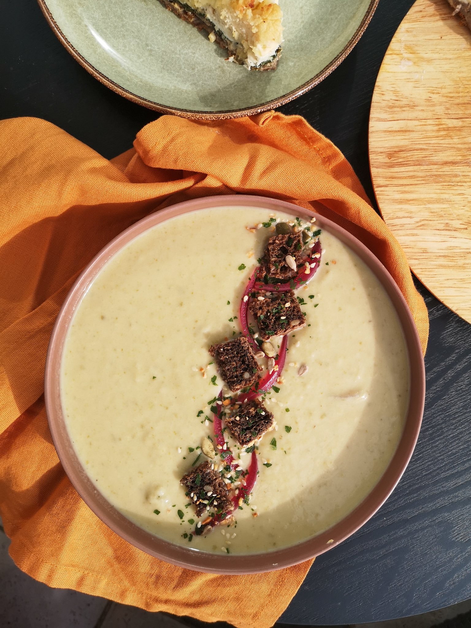 Après avoir réalisé cette délicieuse tarte au chou-fleur et galettes de sarrasin, il me restait pas mal de feuilles de chou-fleur sur les bras. Pas question de les jeter à la poubelle, j’ai préparé avec un onctueux velouté de feuilles de chou-fleur et pommes de terre pour le dîner. Voici la recette.