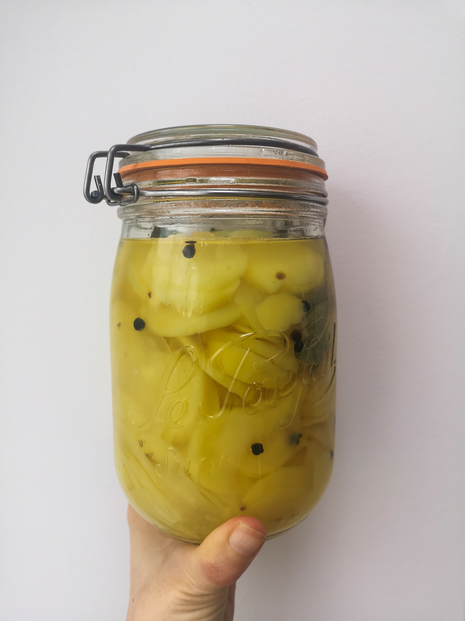 Sur ce site, je vous ai déjà donné pas mal de recettes de pickles à base de choux-fleur, carottes, radis, poivrons ou même rhubarbe. Aujourd’hui, je vous propose une recette anti-gaspi et originale de pickles de pommes de terre, pour agrémenter vos salades ou sandwichs d’une petite pointe d’acidité croquante.
